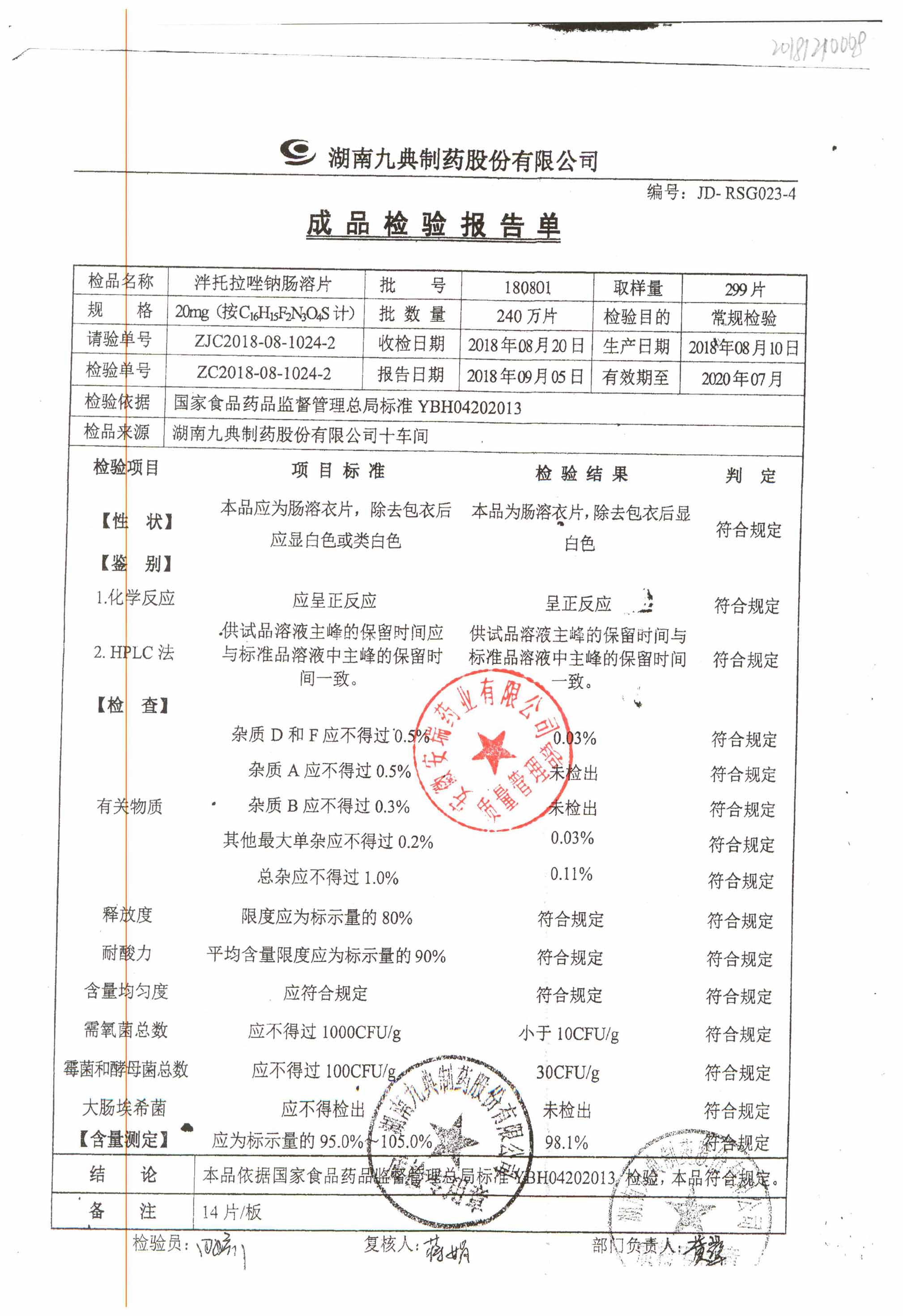 泮托拉唑钠肠溶片 | 20mg | 180801 | 查看详情 |