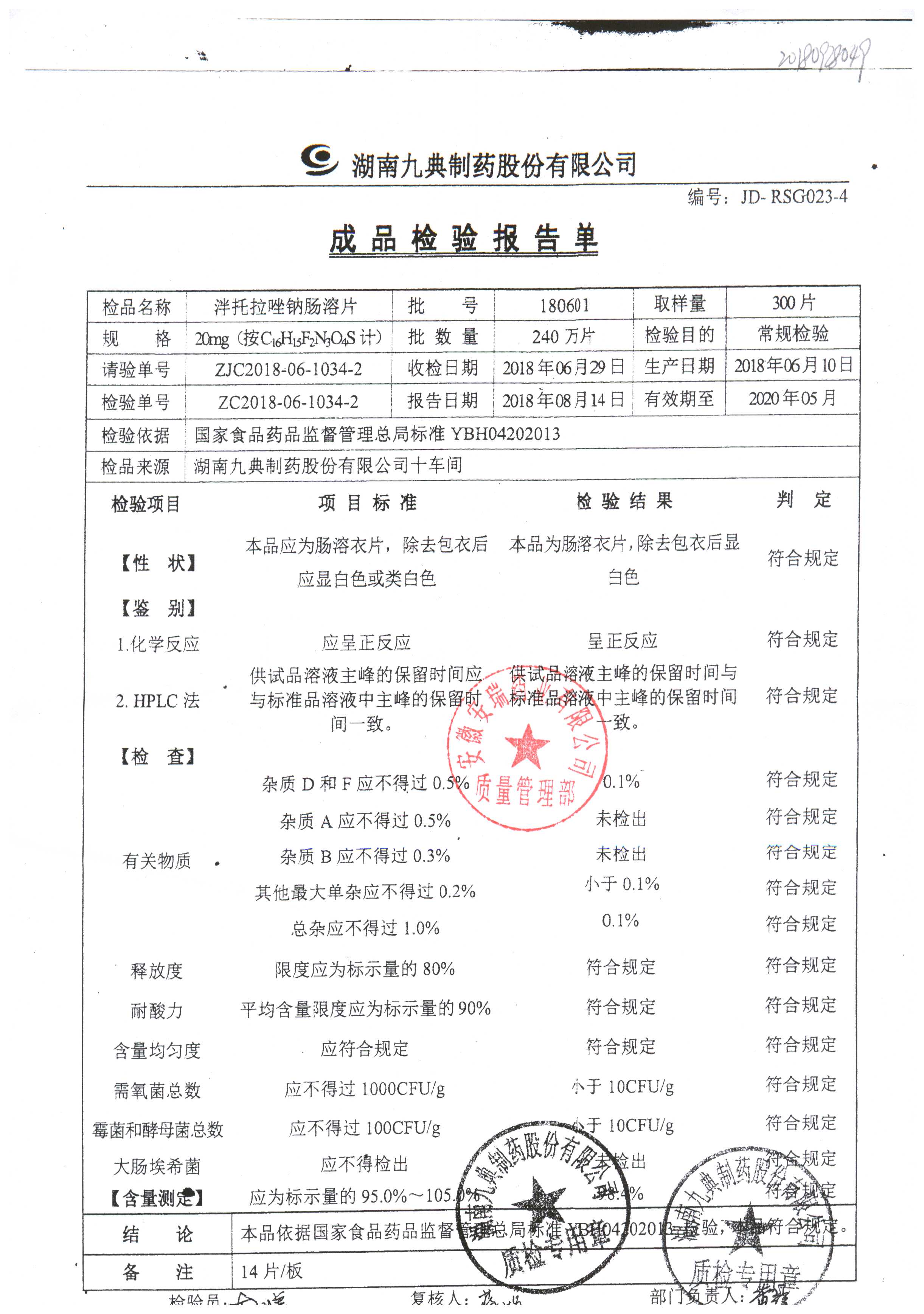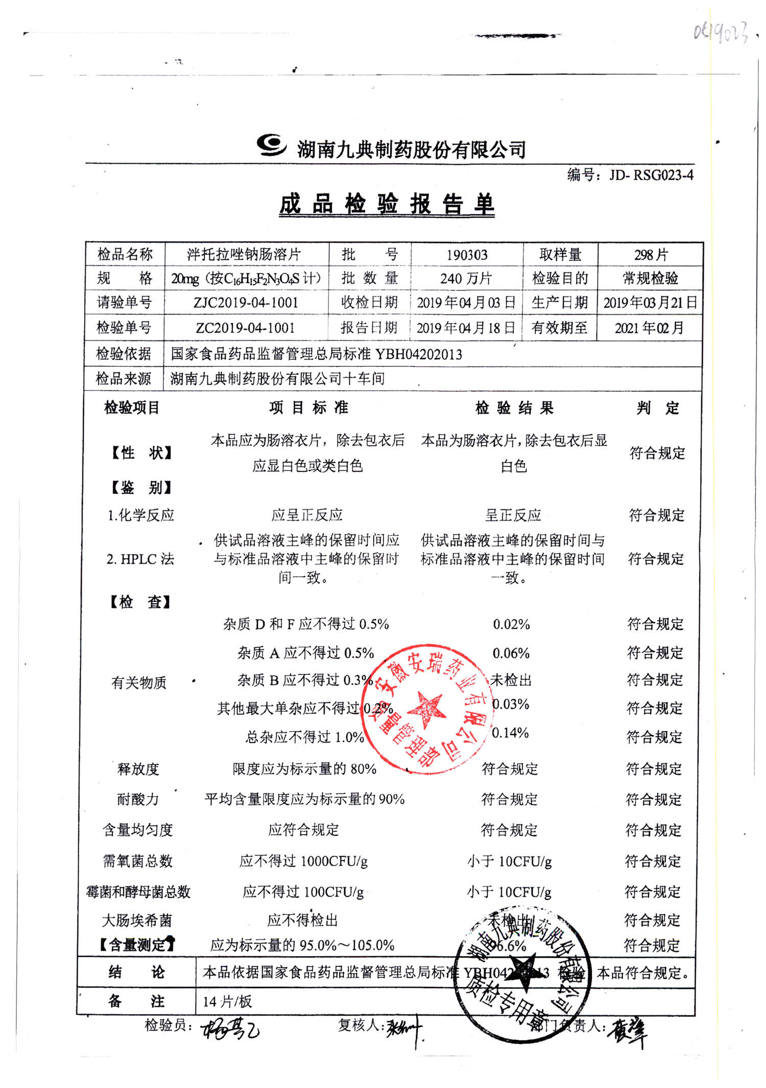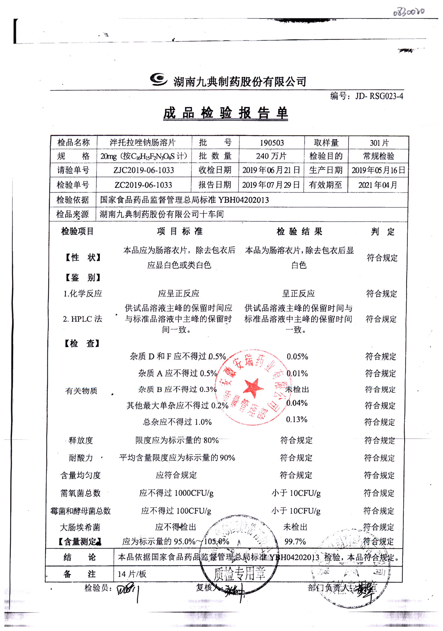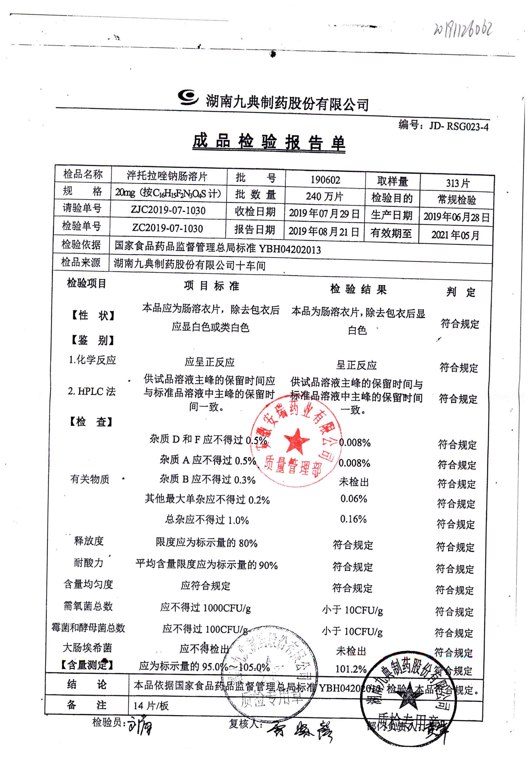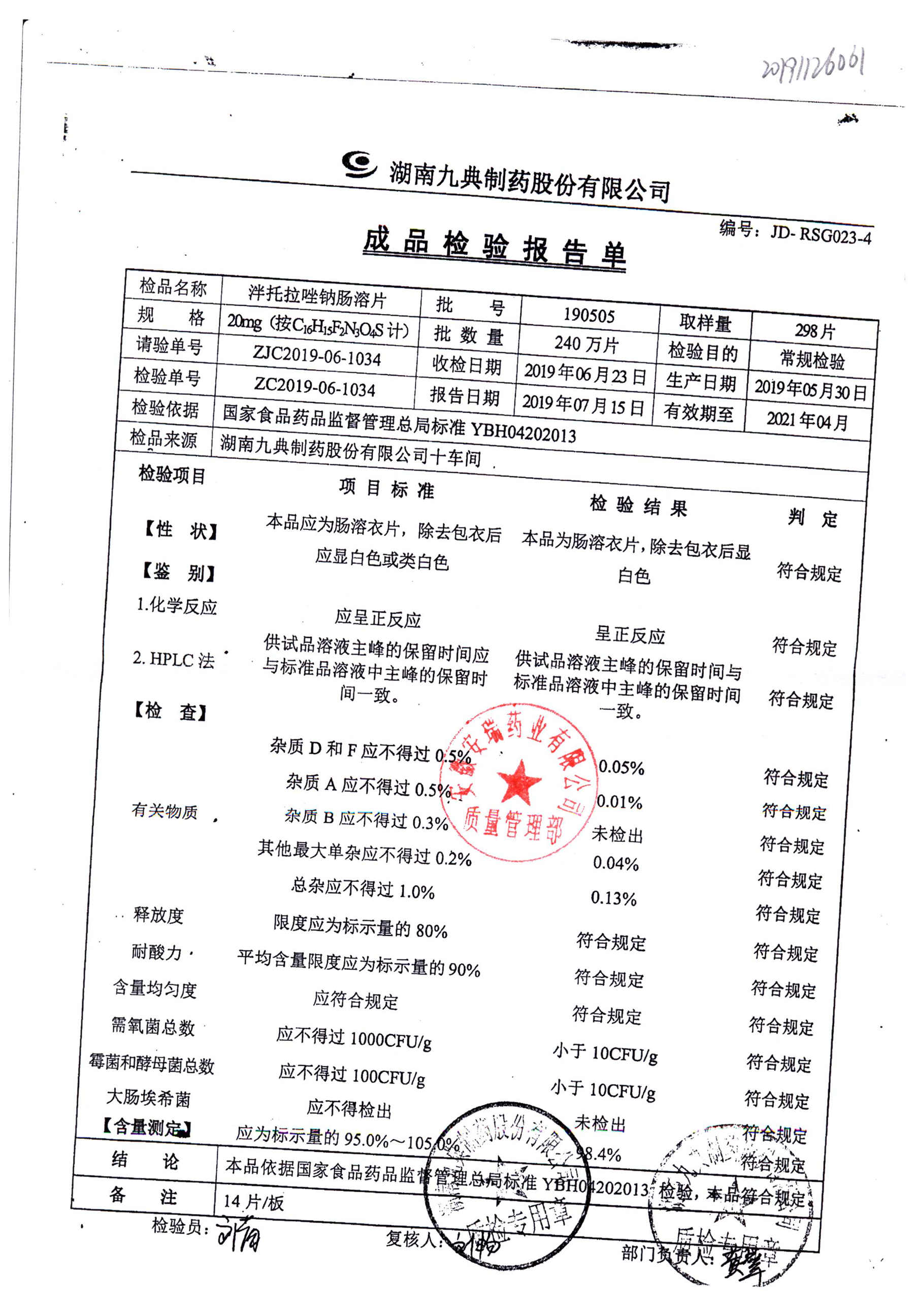 泮托拉唑钠肠溶片 | 20mg | 190505 | 查看详情 |