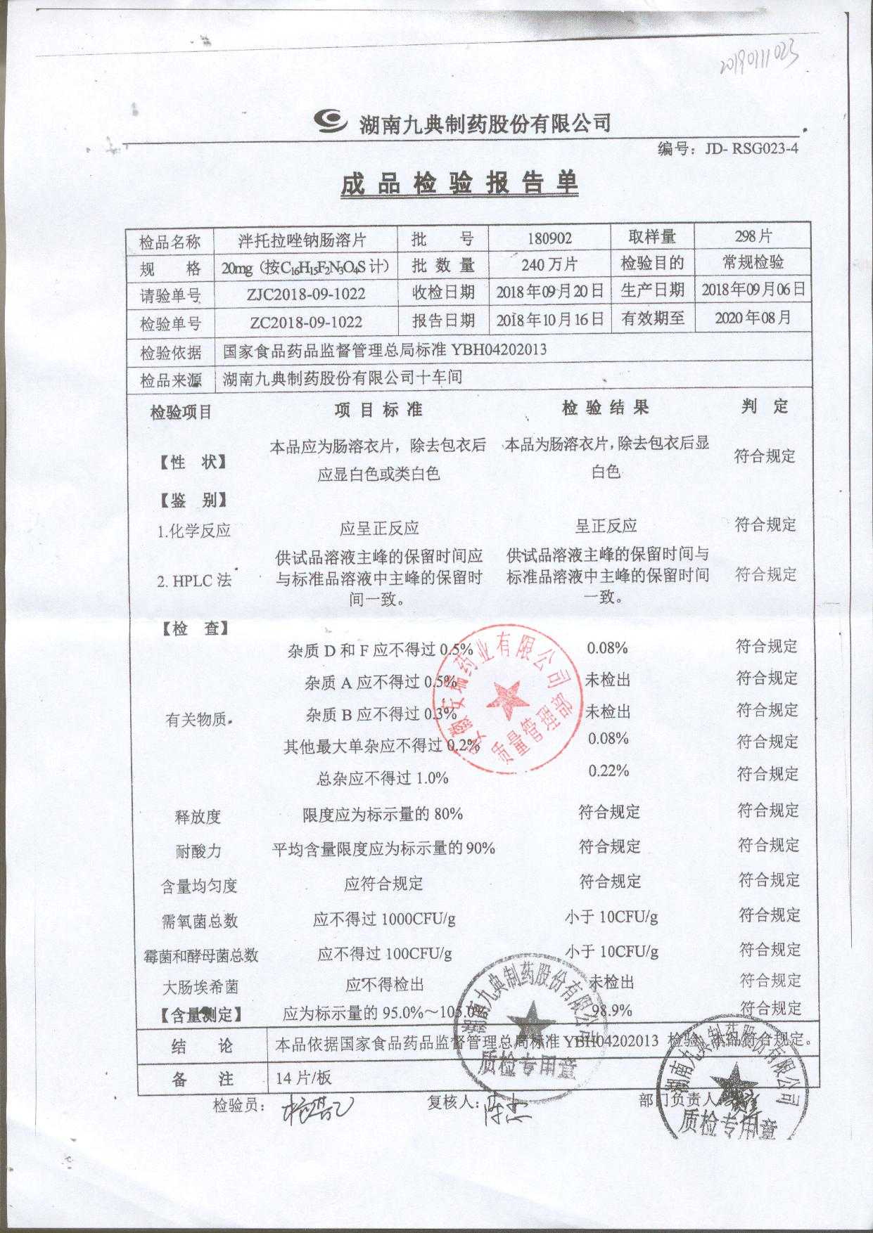 泮托拉唑钠肠溶片 | 20mg | 180902 | 查看详情 |