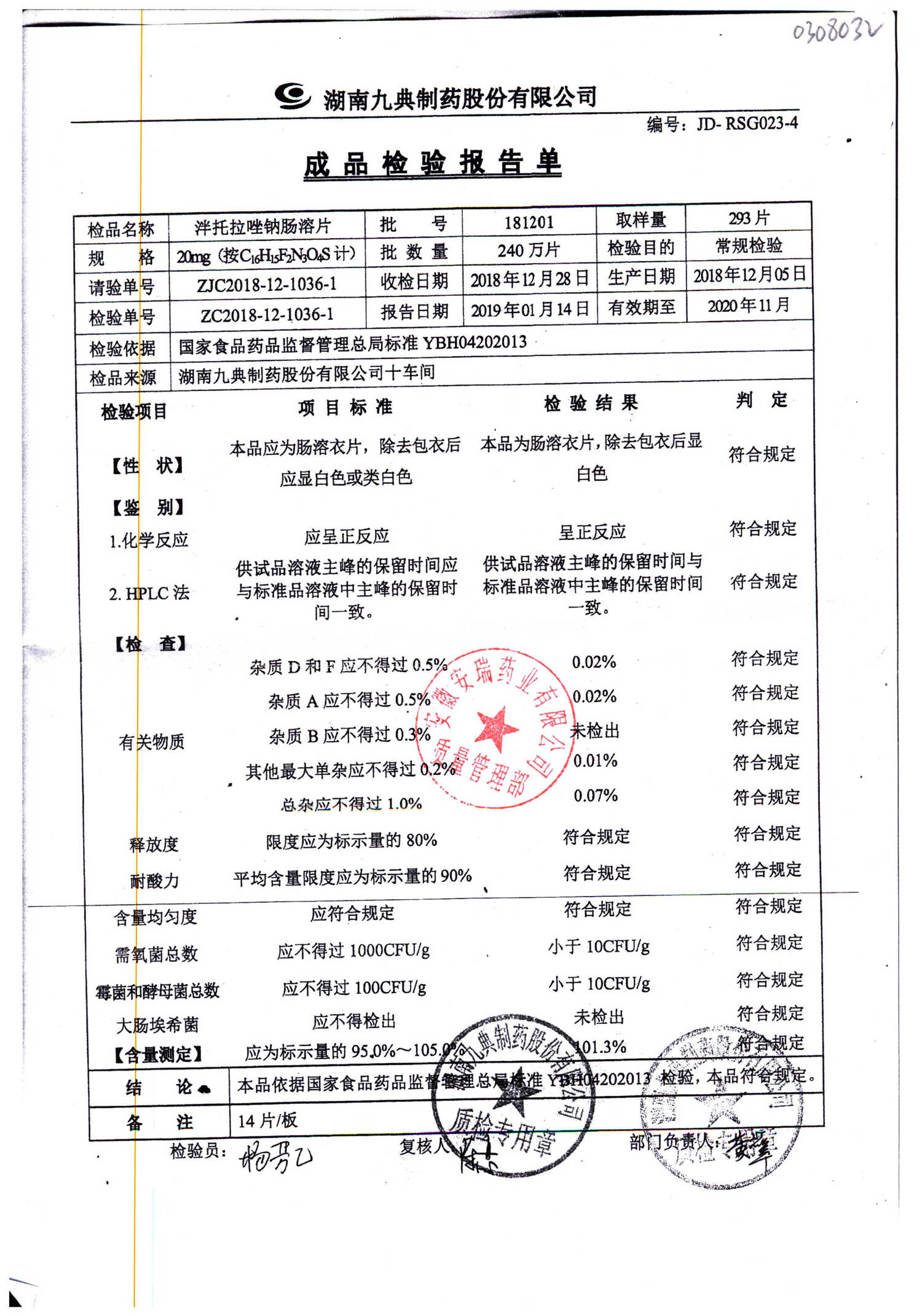 泮托拉唑钠肠溶片 | 20mg | 190503 | 查看详情 |