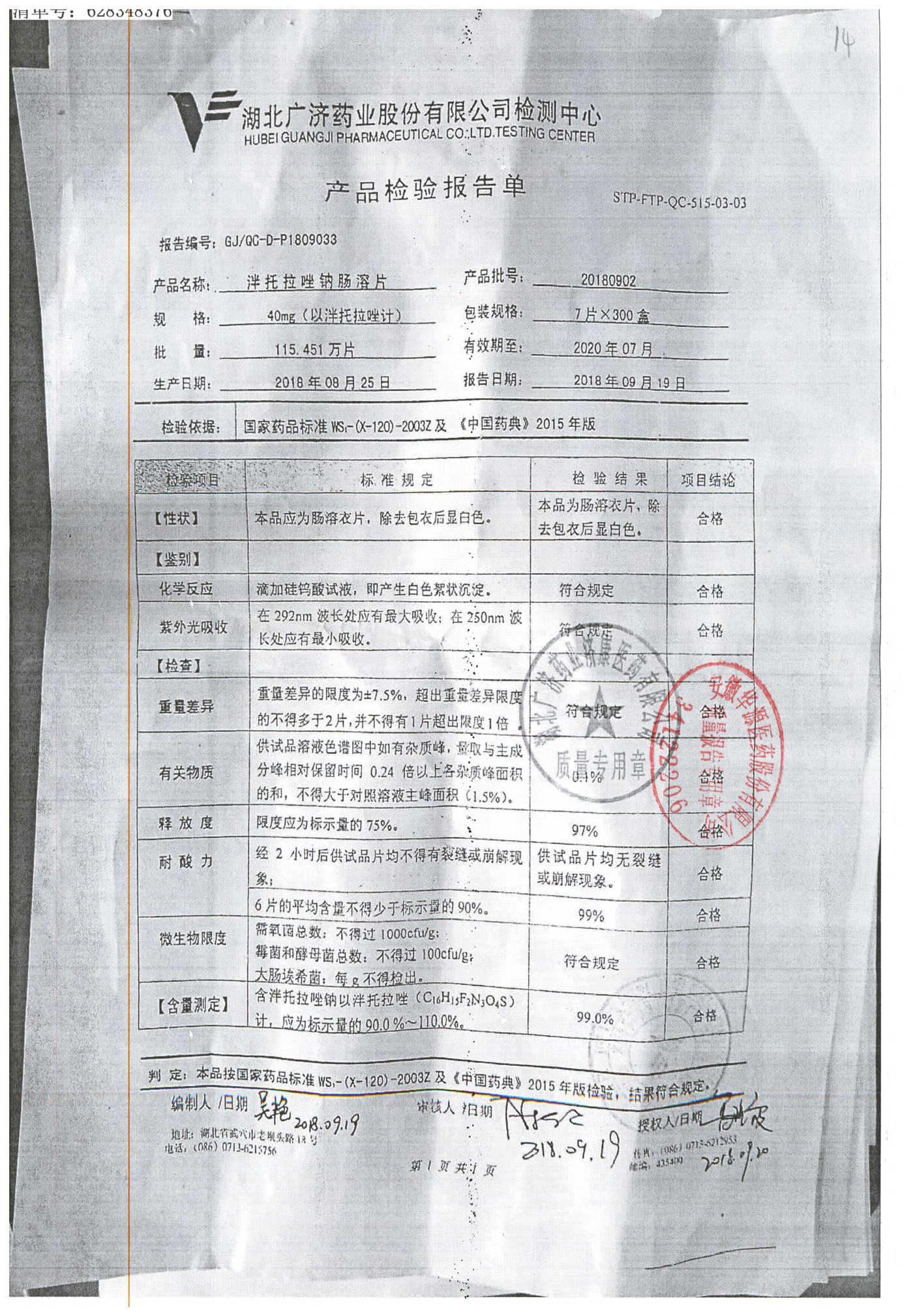 泮托拉唑钠肠溶片 | 40mg | 20180902 | 查看详情 |