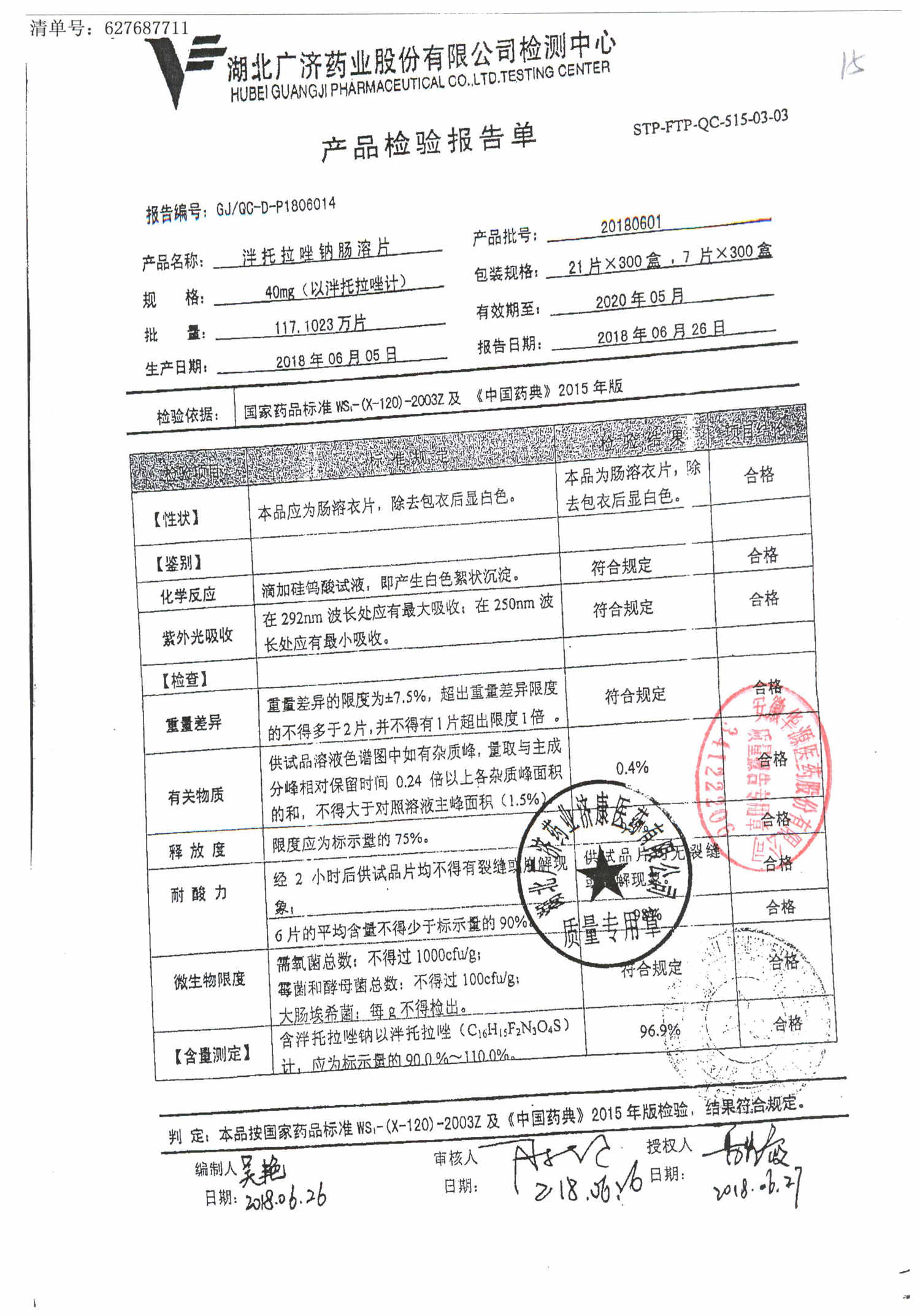 泮托拉唑钠肠溶片 | 40mg | 20180601 | 查看详情 |