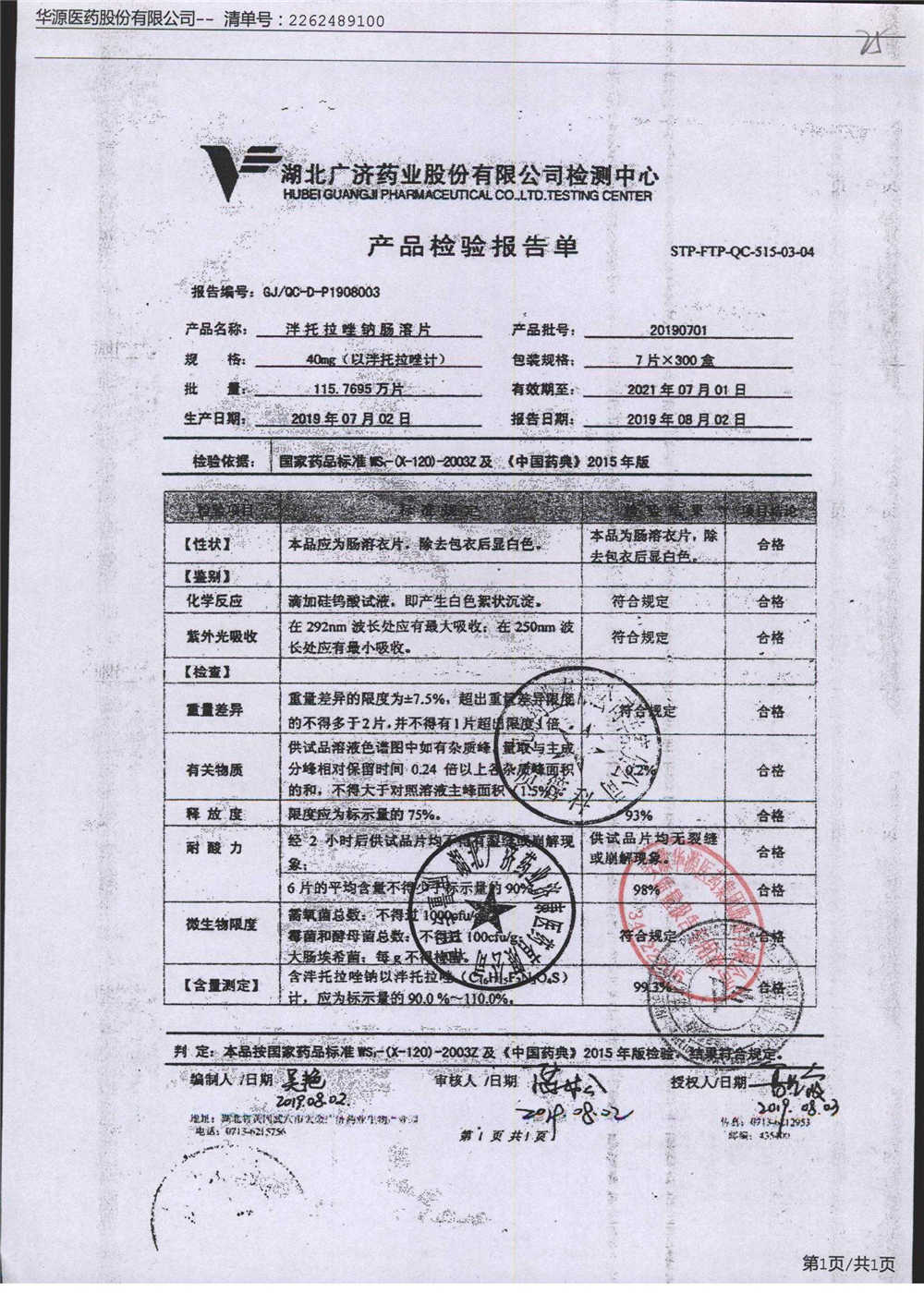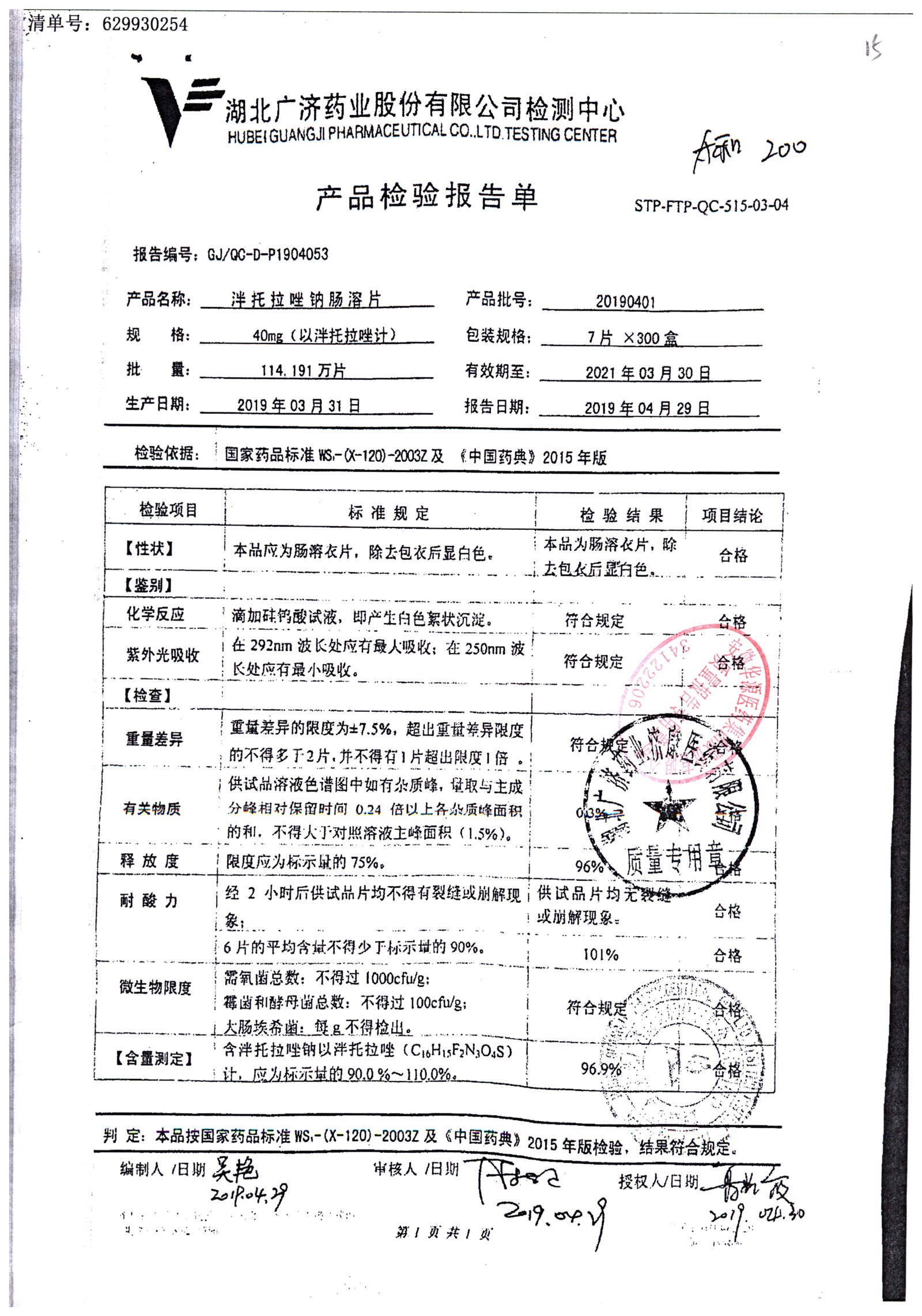 泮托拉唑钠肠溶片 | 40mg | 20190401 | 查看详情 |