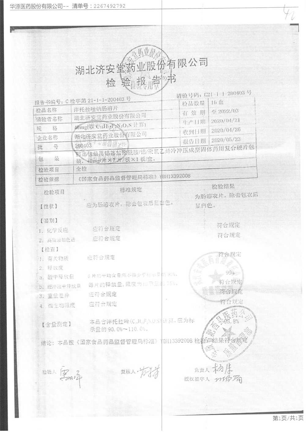 泮托拉唑钠肠溶片 | 40mg | 200403 | 查看详情 |