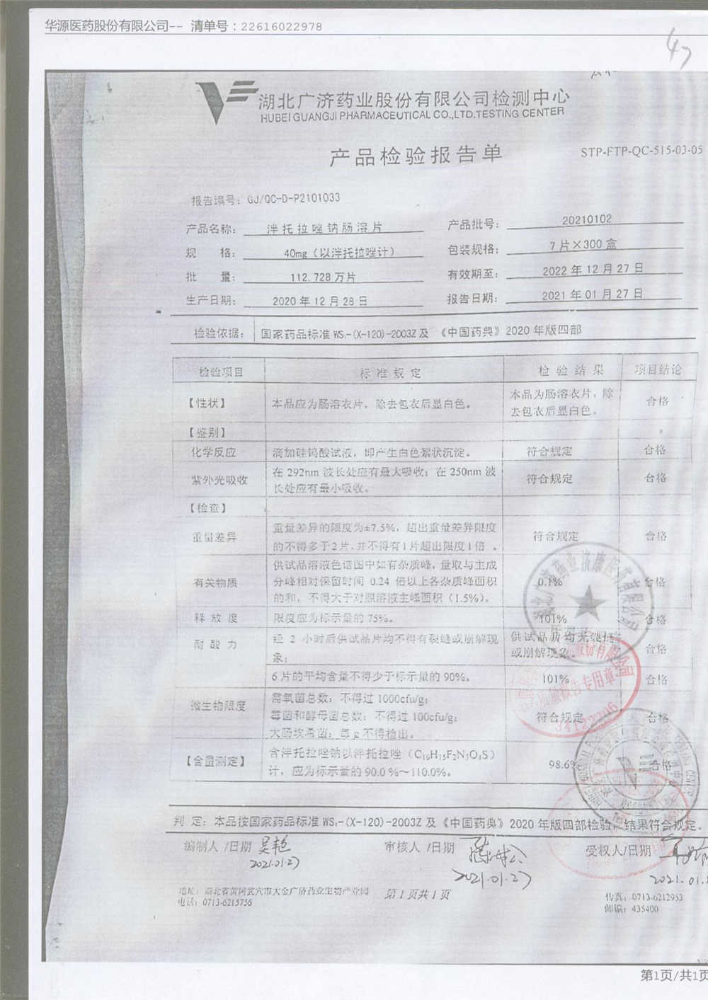 泮托拉唑钠肠溶片 | 40mg | 20210102 | 查看详情 |