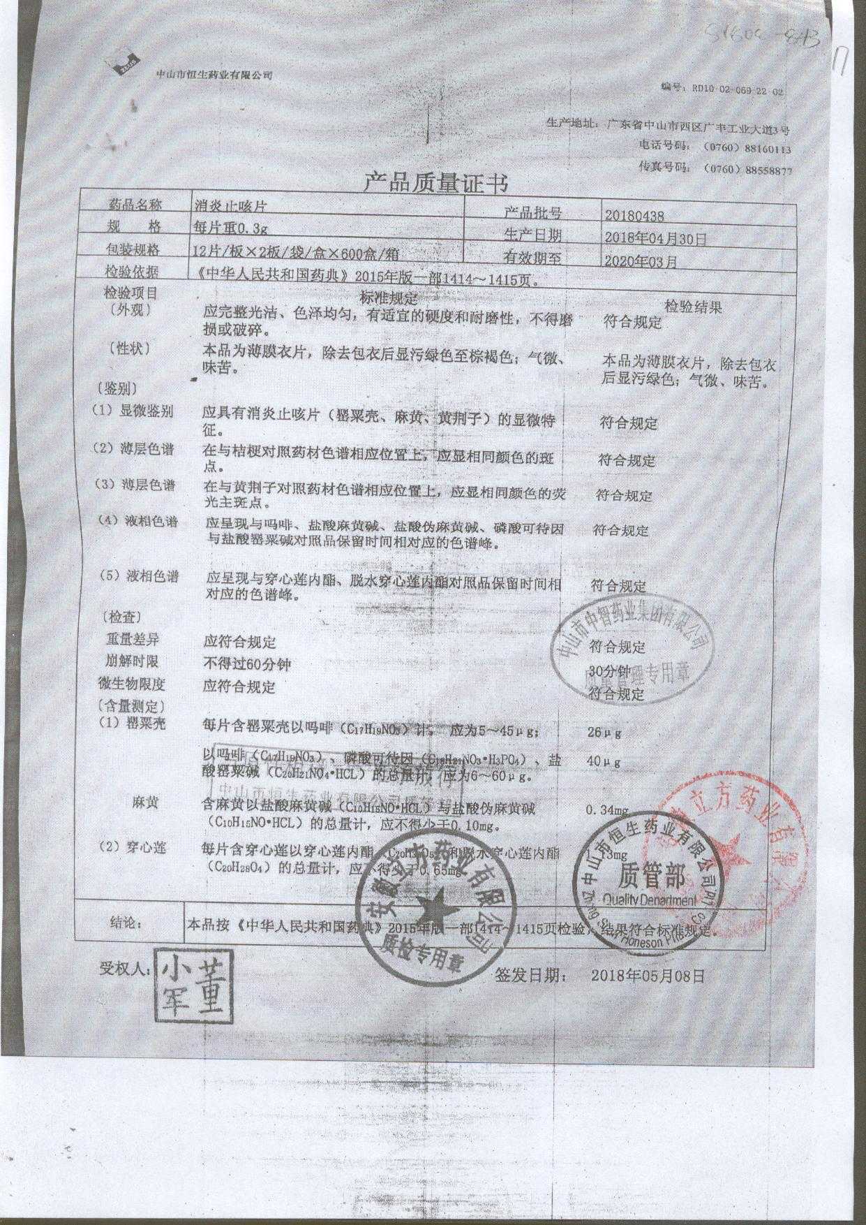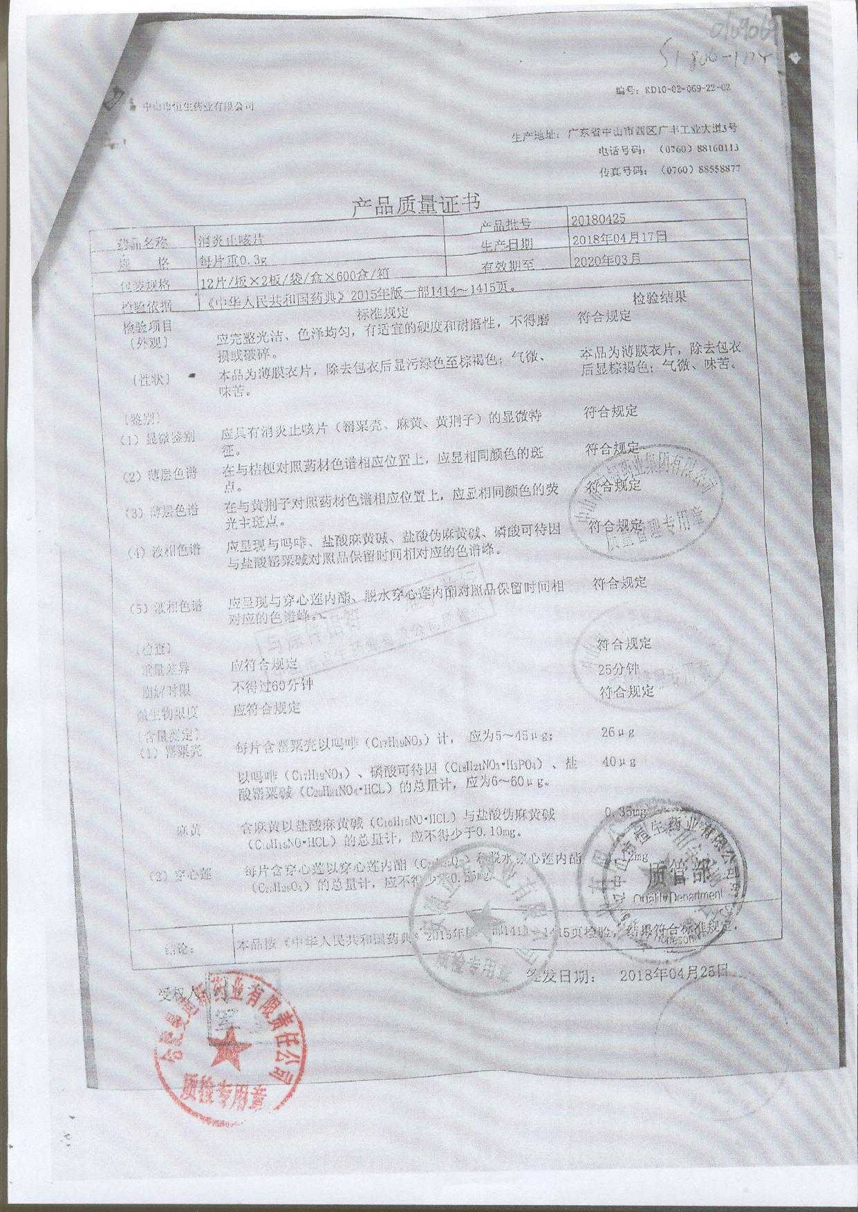 消炎止咳片 | 0.3g*24片 | 20180425 | 查看详情 |