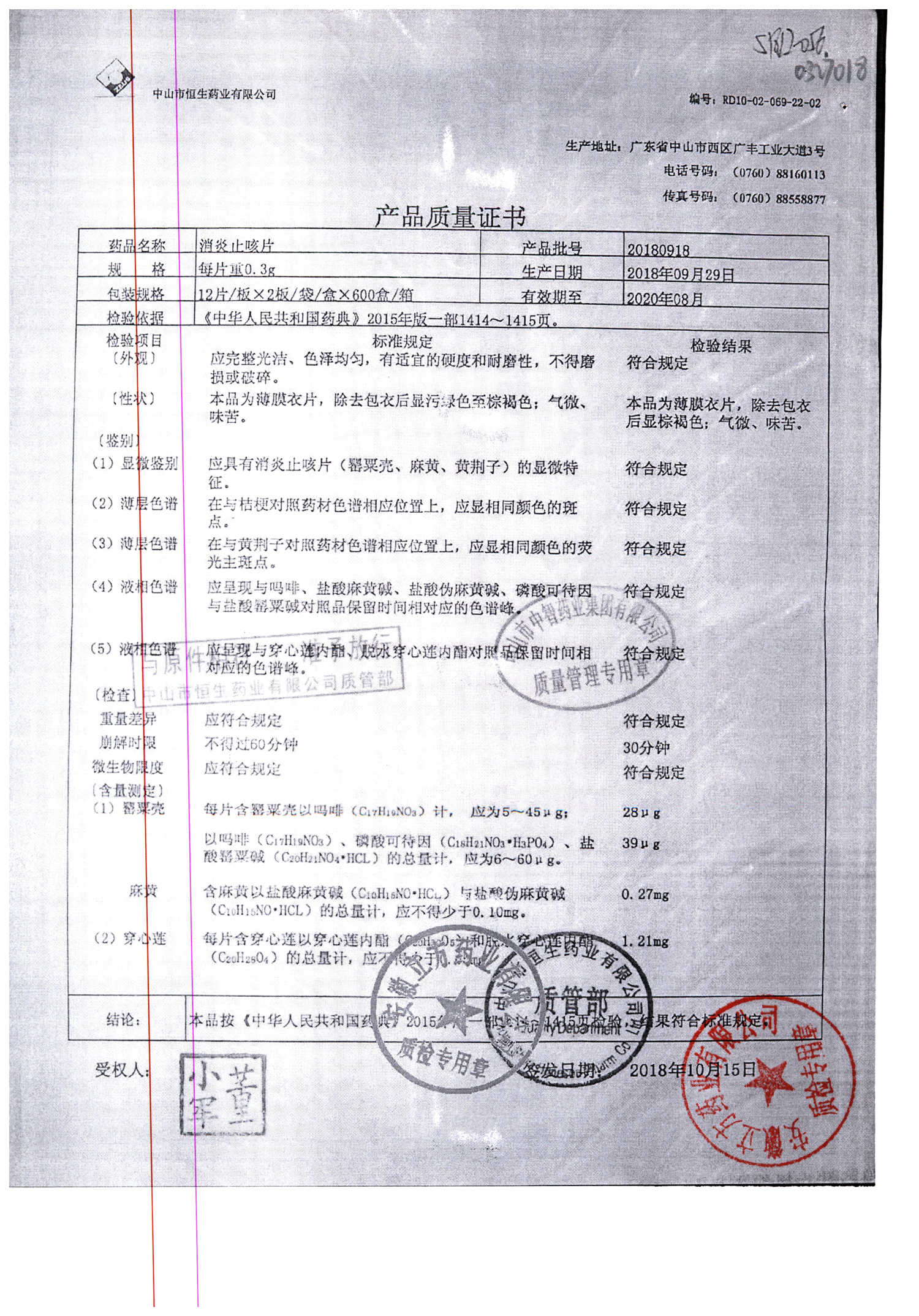 消炎止咳片 | 0.3g*24片 | 20180918 | 查看详情 |