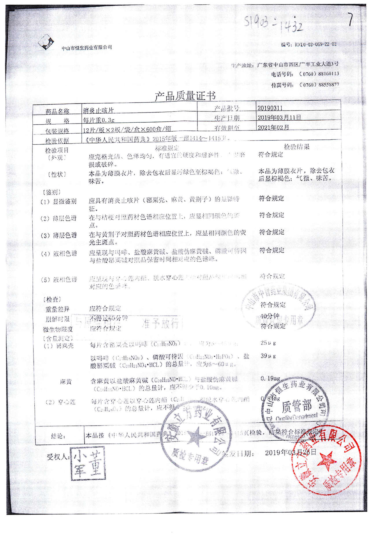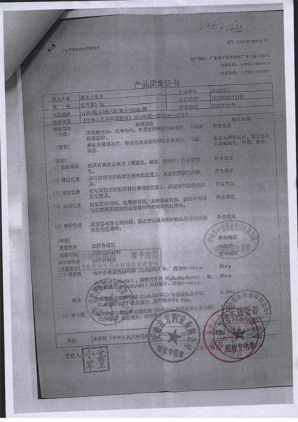 消炎止咳片 | 0.3g*24片 | 20190311 | 查看详情 |