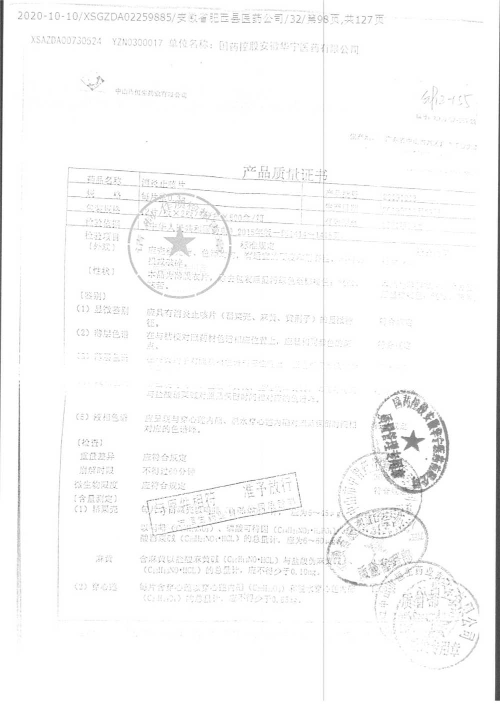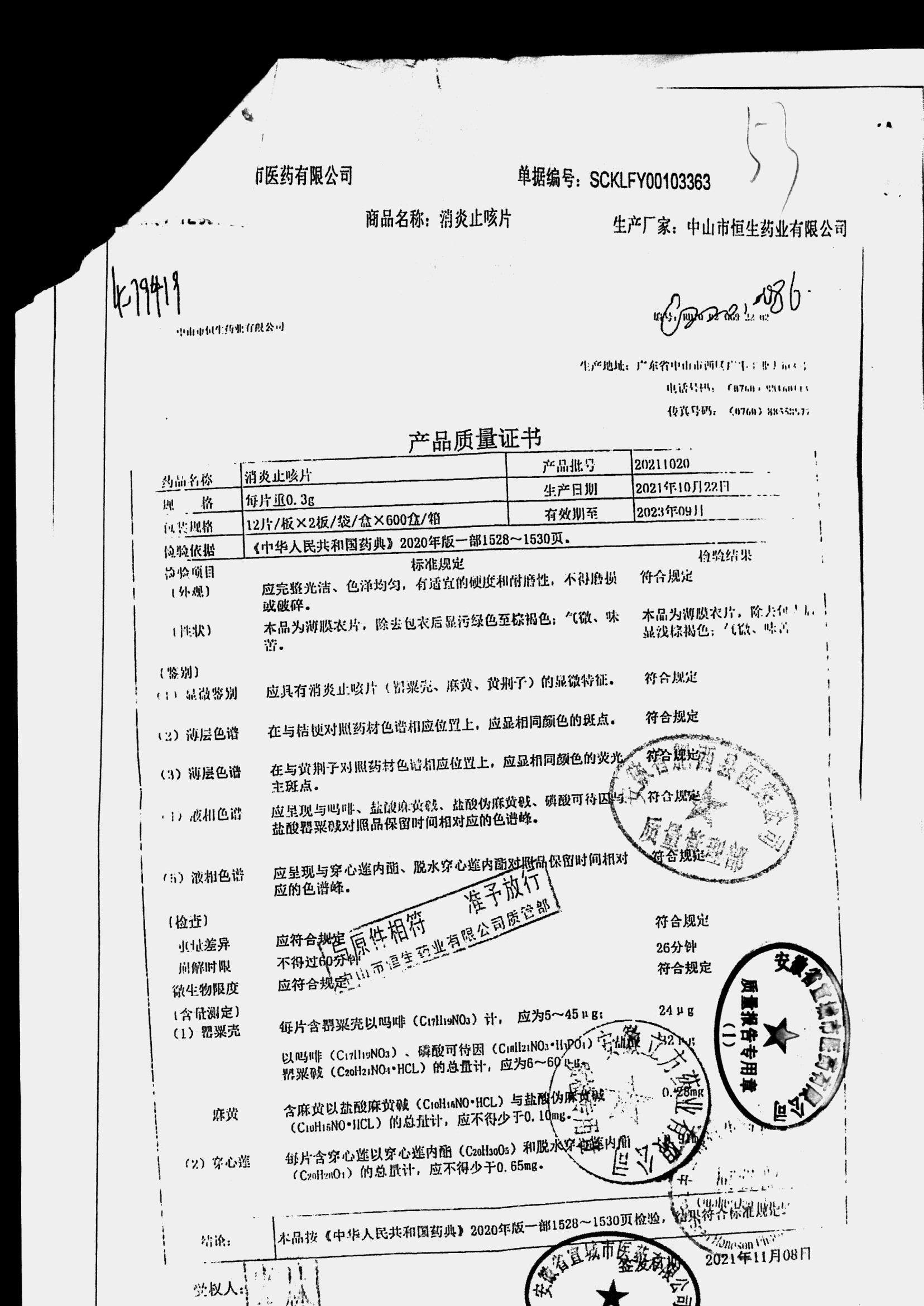 消炎止咳片 | 0.3g*24片 | 20211020 | 查看详情 |