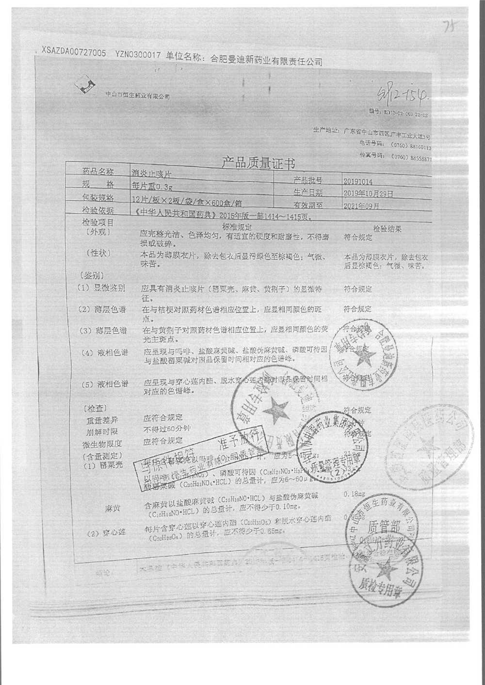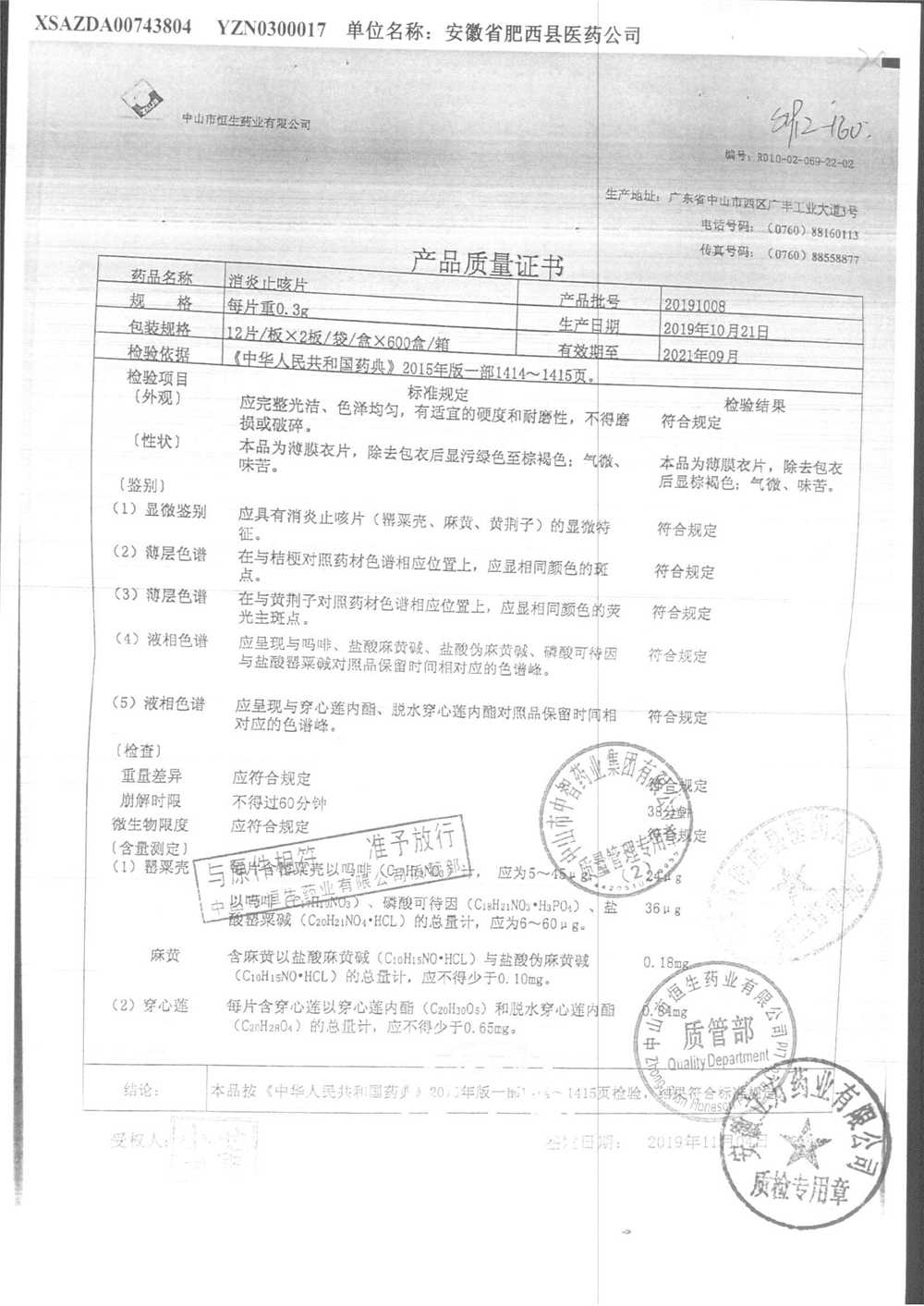 消炎止咳片 | 0.3g*24片 | 20191008 | 查看详情 |