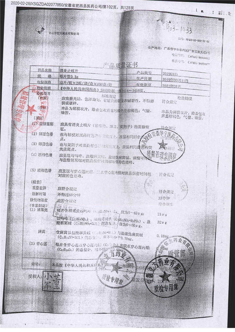 消炎止咳片 | 0.3g*24片 | 20191014 | 查看详情 |
