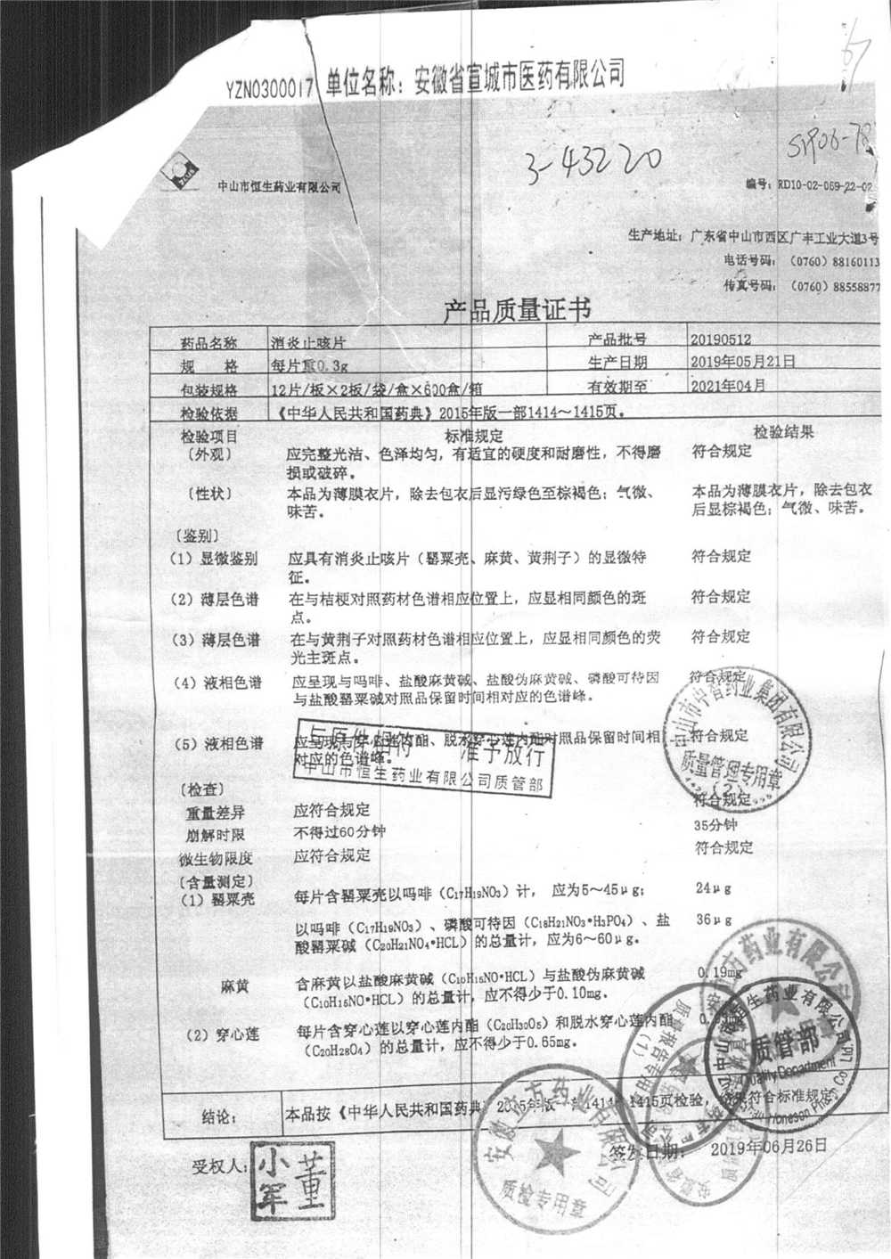 消炎止咳片 | 0.3g*24片 | 20190512 | 查看详情 |