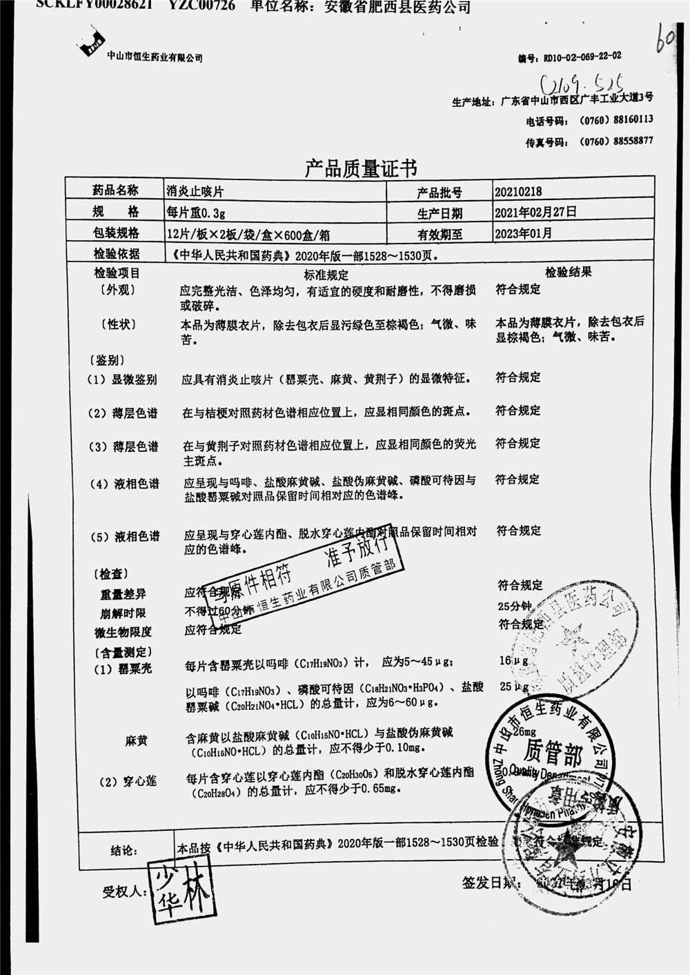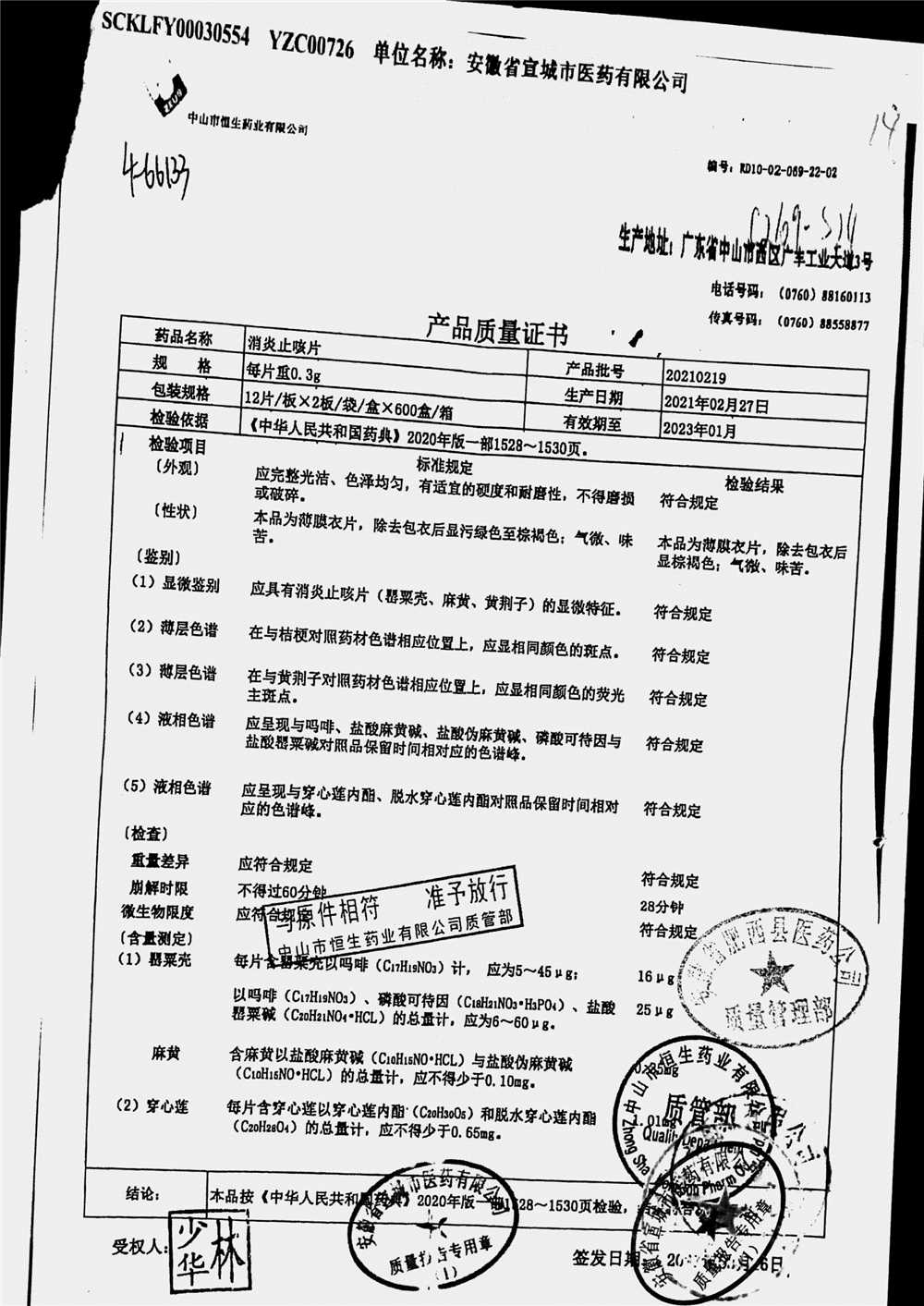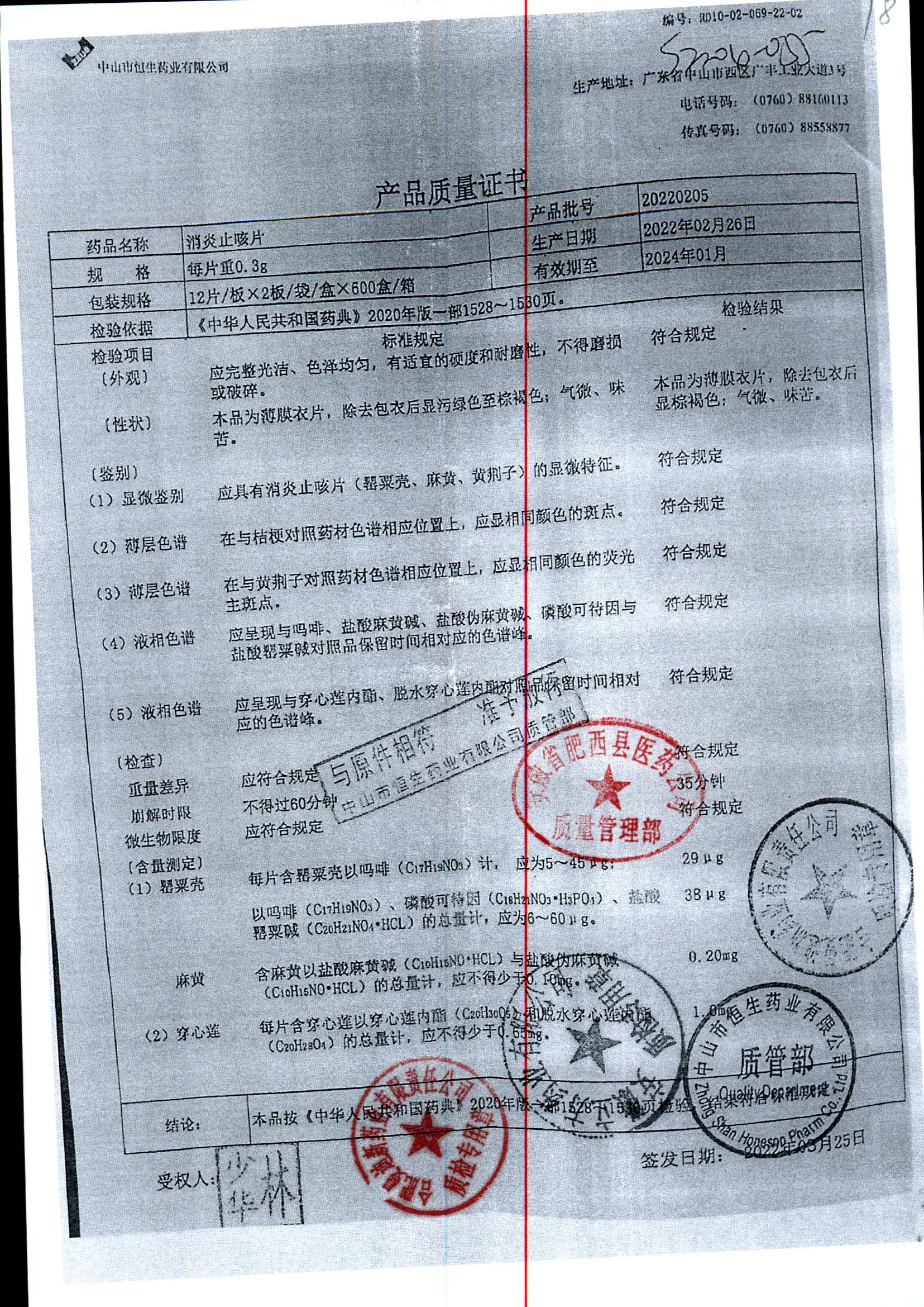 消炎止咳片 | 0.3g*24片 | 20220205 | 查看详情 |