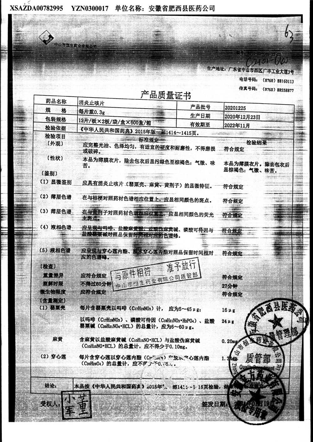 消炎止咳片 | 0.3g*24片 | 20201225 | 查看详情 |