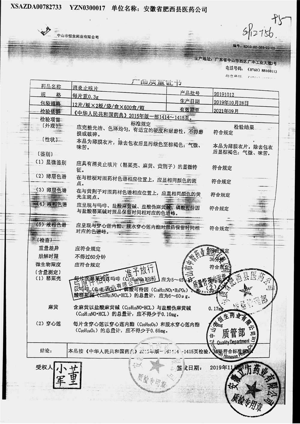 消炎止咳片 | 0.3g*24片 | 20191012 | 查看详情 |