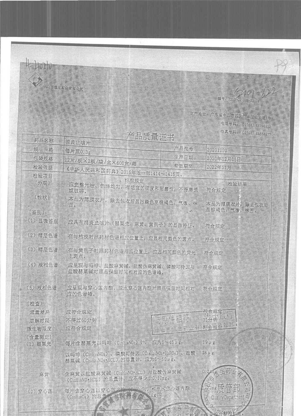 消炎止咳片 | 0.3g*24片 | 20201202 | 查看详情 |