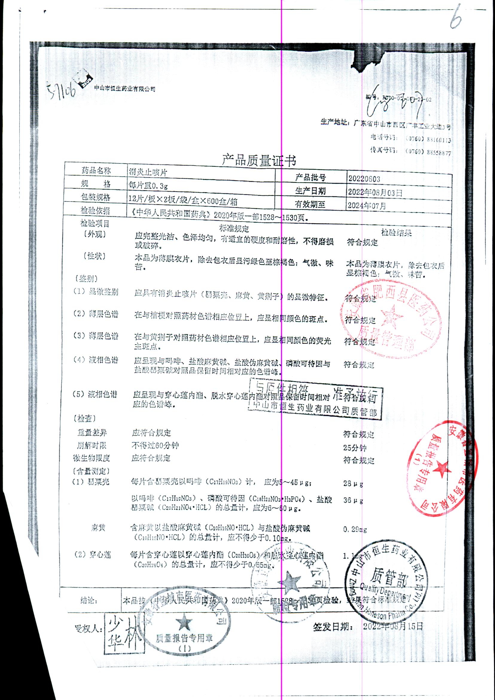 消炎止咳片 | 0.3g*24片 | 20220603 | 查看详情 |