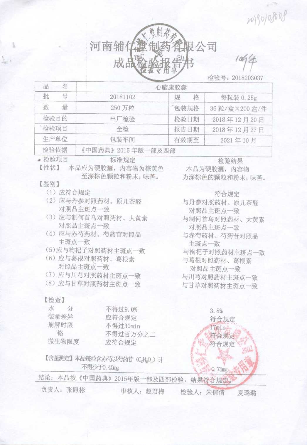 心脑康胶囊 | 0.25g*36粒 | 20181102 | 查看详情 |