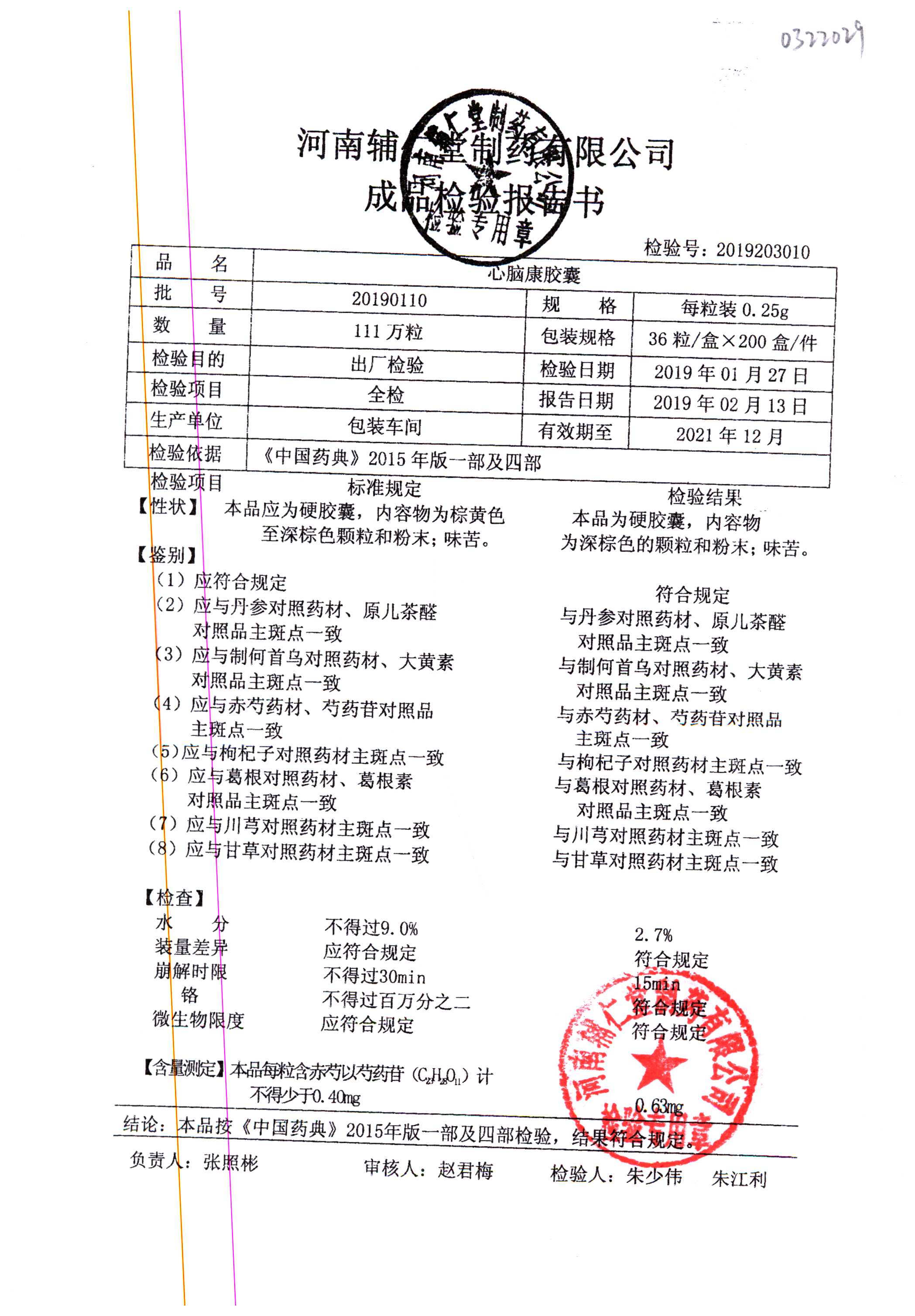 心脑康胶囊 | 0.25g*36粒 | 20190110 | 查看详情 |