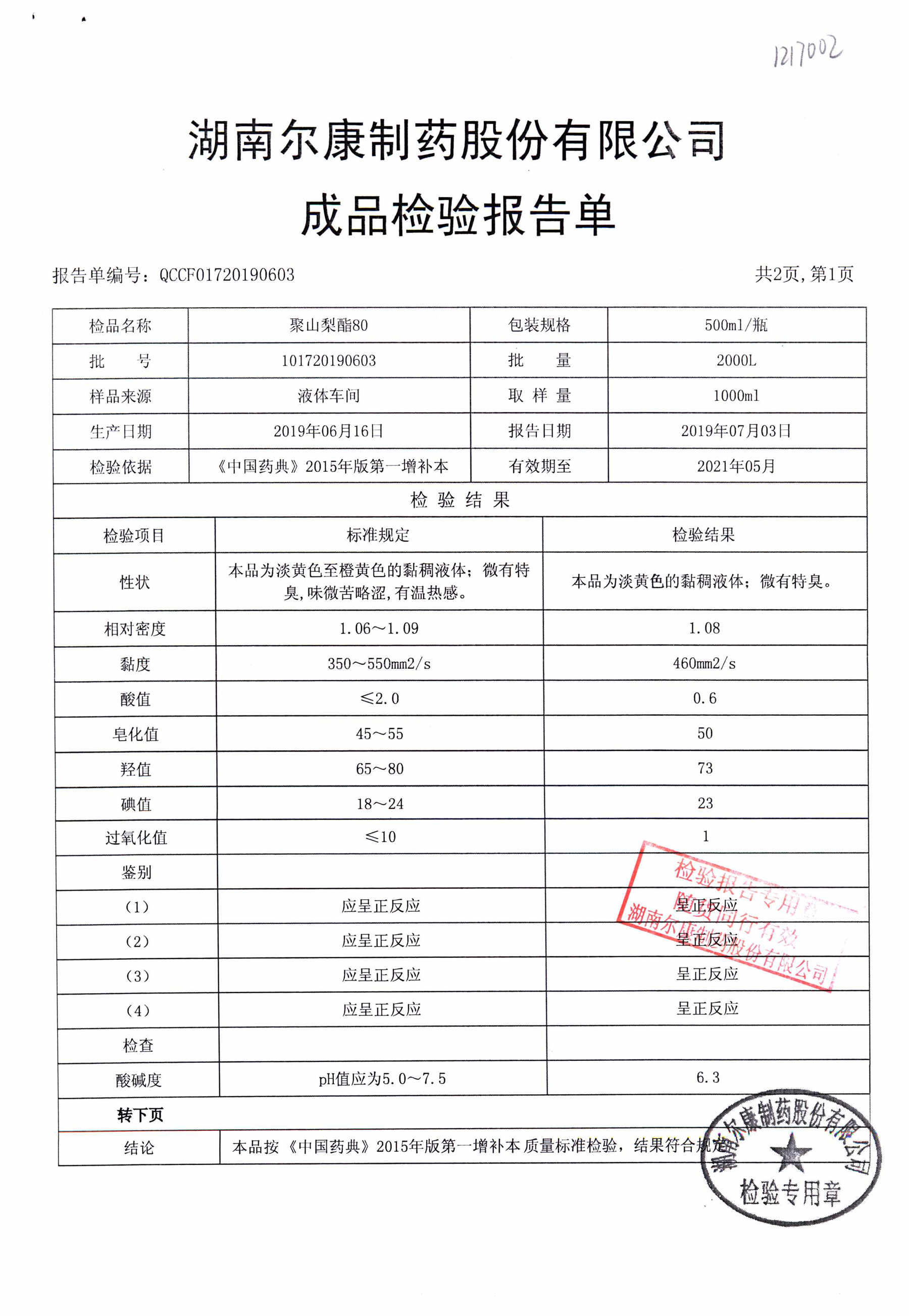 聚山梨酯80 | 500ml | 101720190603(1/2) | 查看详情 |