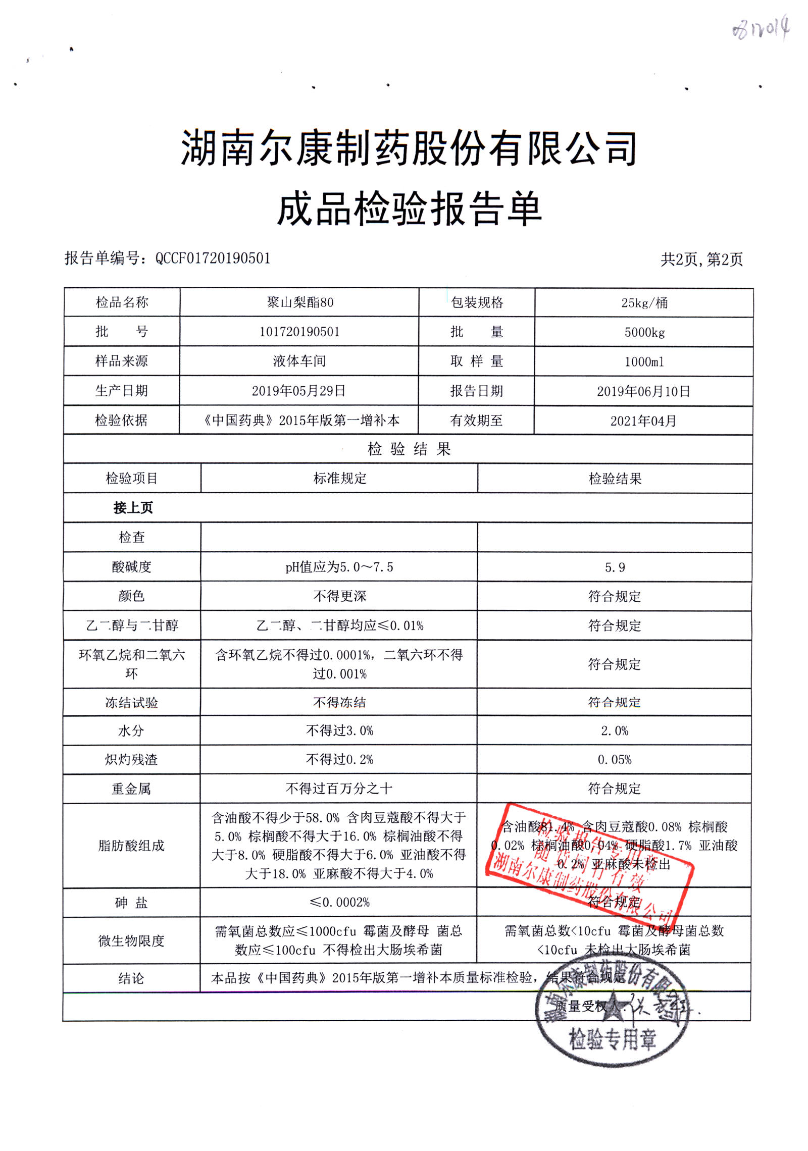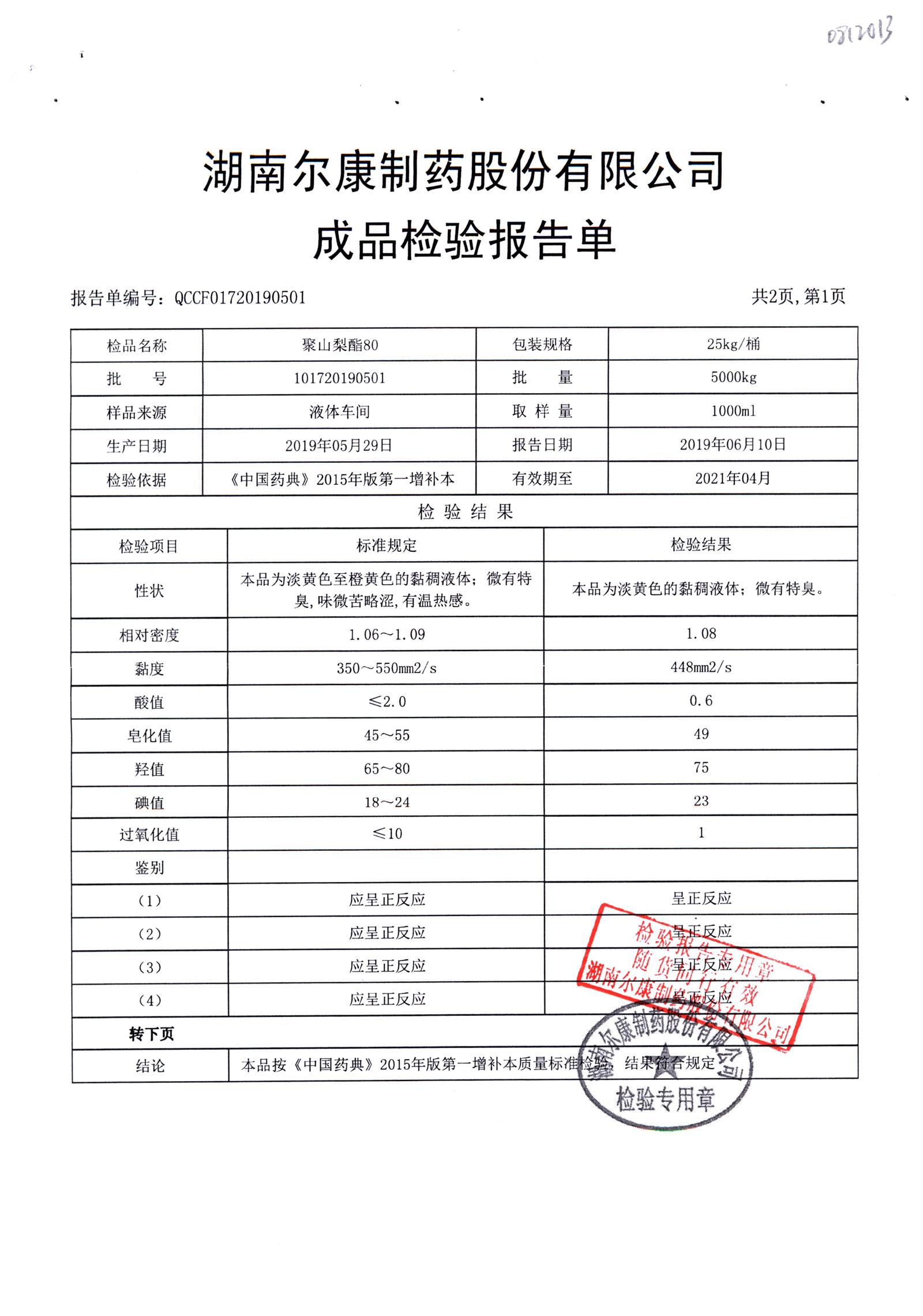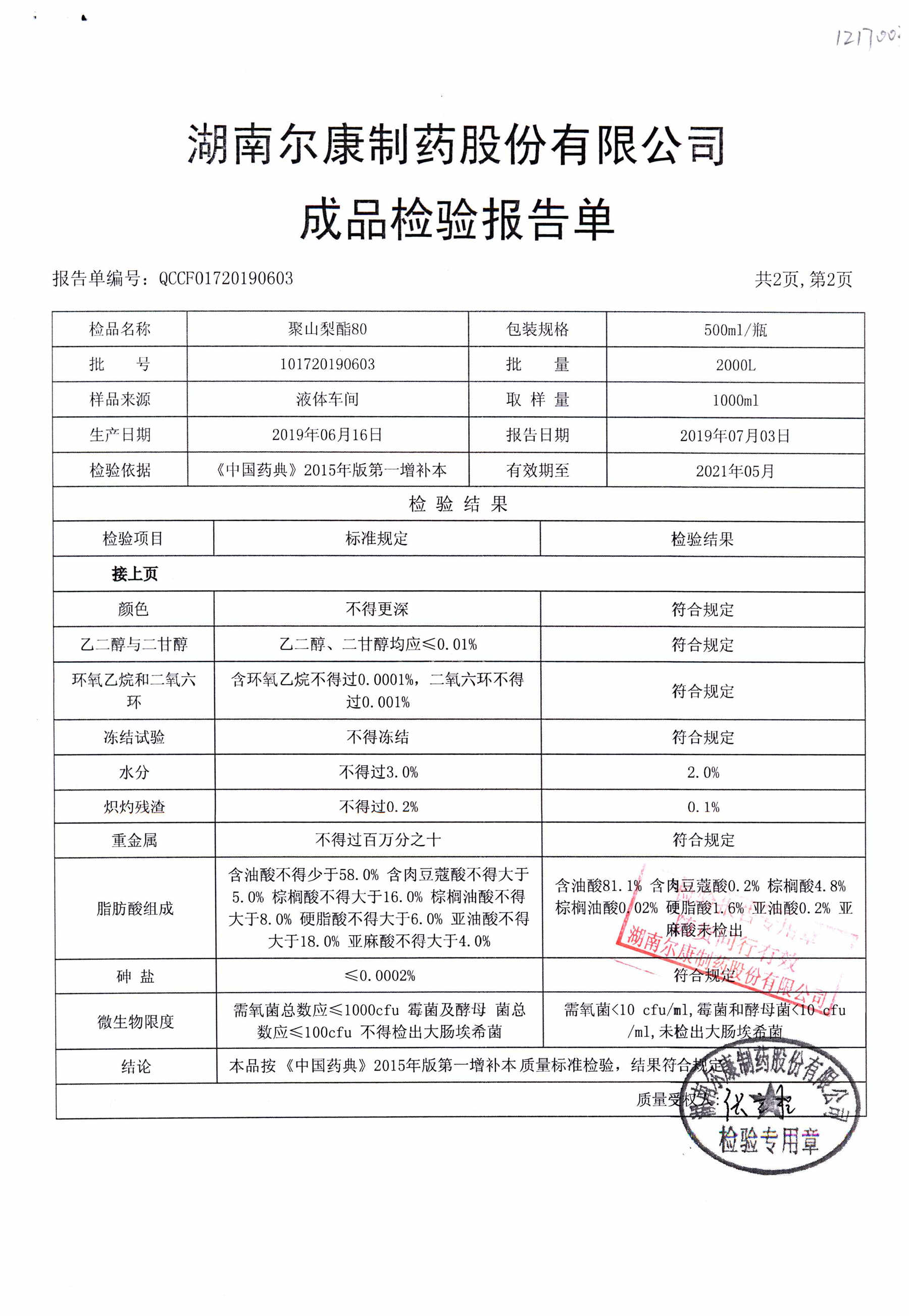 聚山梨酯80 | 500ml | 101720190501(1/2) | 查看详情 |