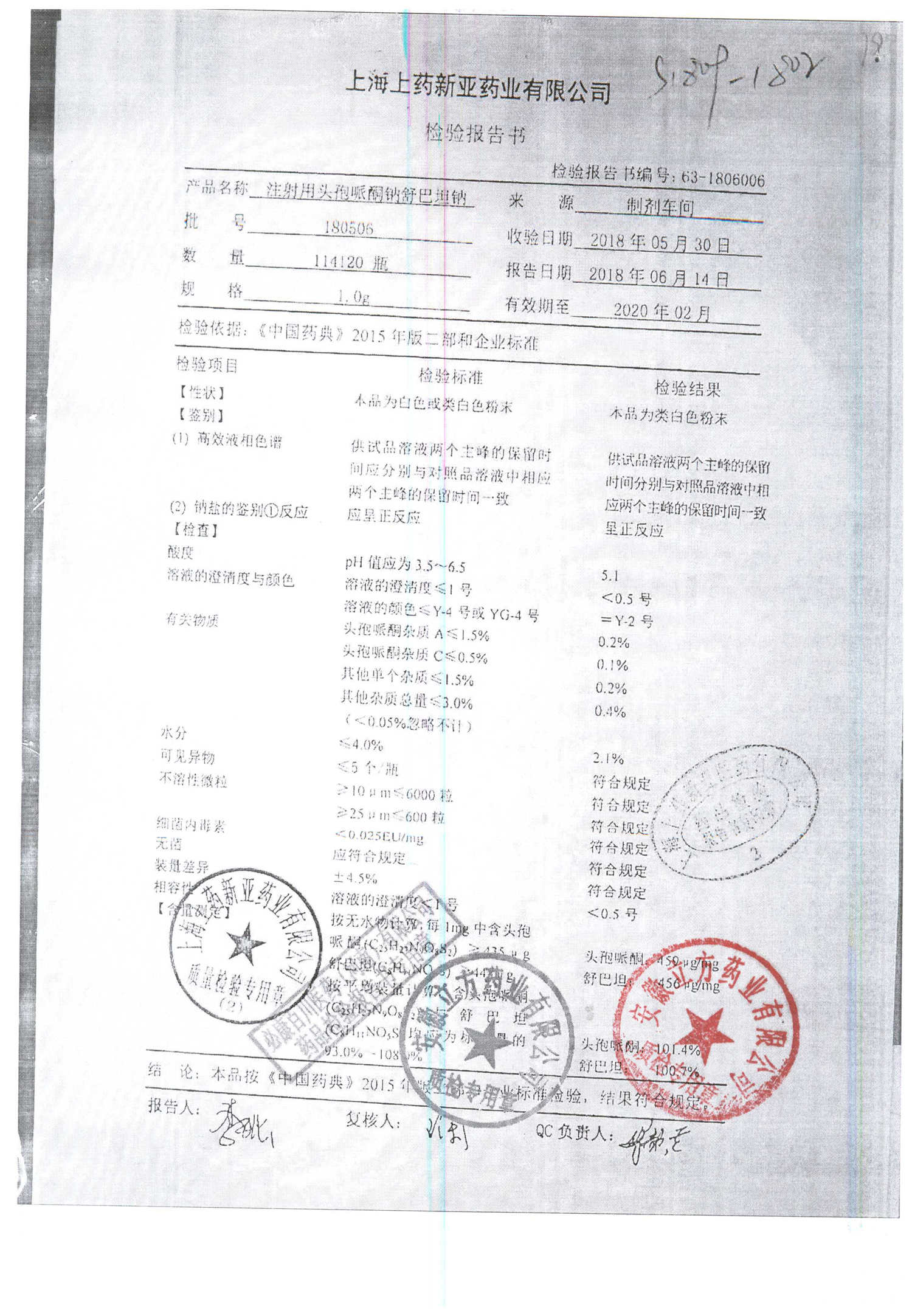 注射用头孢哌酮钠舒巴坦钠 | 1.0g | 180506 | 查看详情 |