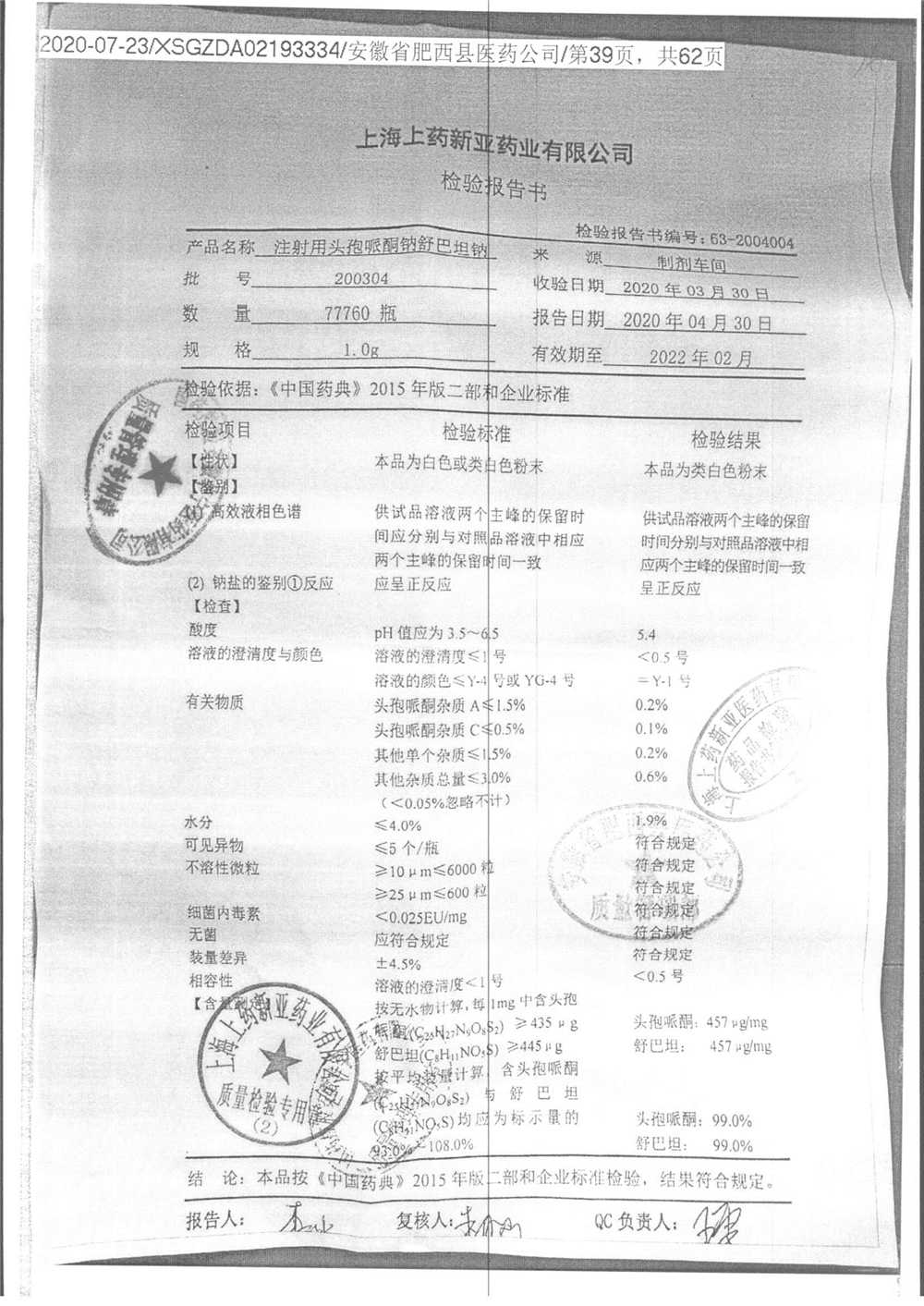 注射用头孢哌酮钠舒巴坦钠 | 1.0g | 200502 | 查看详情 |
