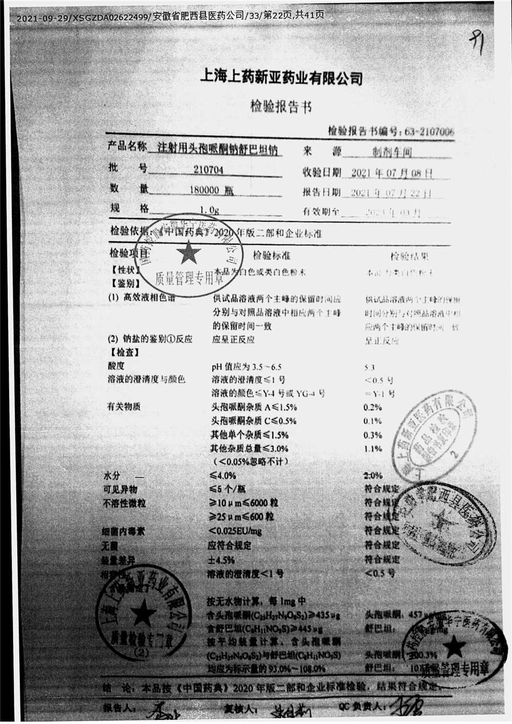 注射用头孢哌酮钠舒巴坦钠 | 1.0g | 210704 | 查看详情 |