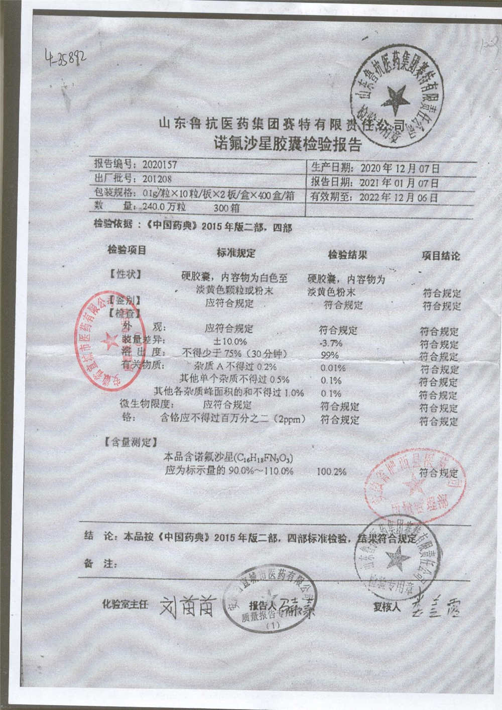 诺氟沙星胶囊 | 0.1g*20粒 | 201208 | 查看详情 |