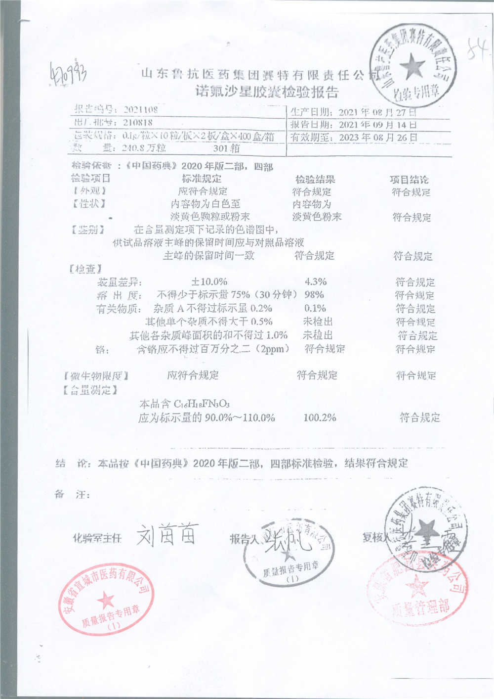 诺氟沙星胶囊 | 0.1g*20粒 | 210818 | 查看详情 |