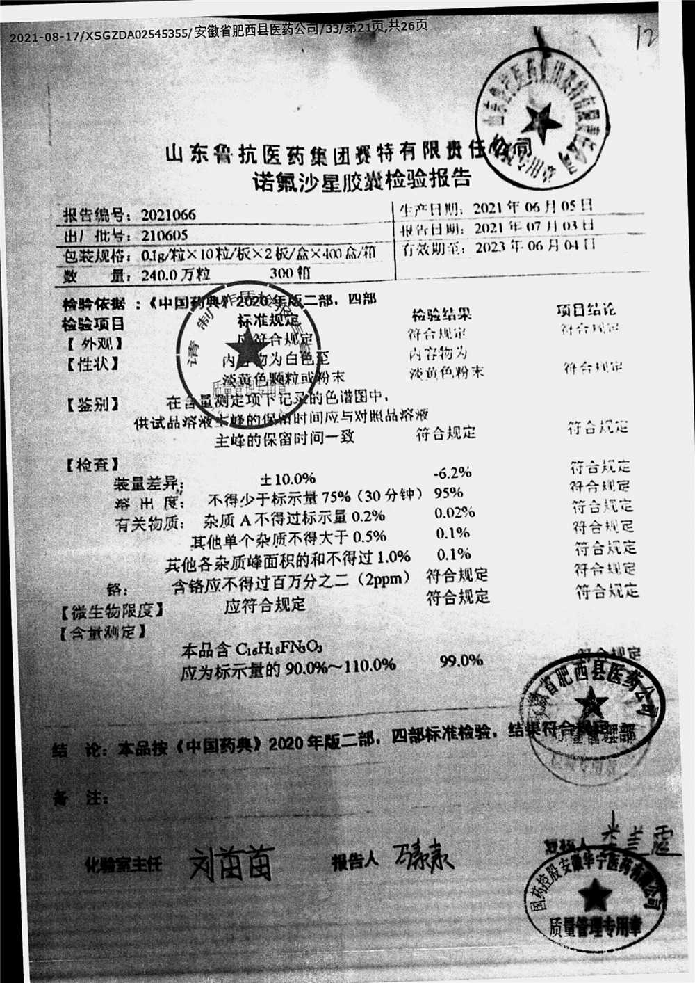 诺氟沙星胶囊 | 0.1g*20粒 | 210605 | 查看详情 |