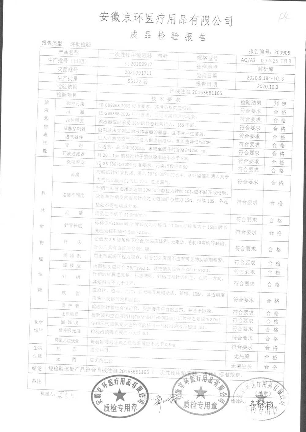 一次性使用输液器 带针 | 0.7*25 | 20200917 | 查看详情 |