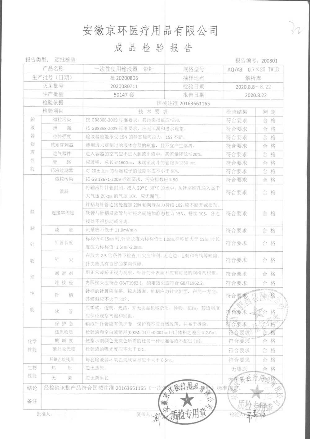 一次性使用输液器 带针 | 0.7*25 | 20200806 | 查看详情 |