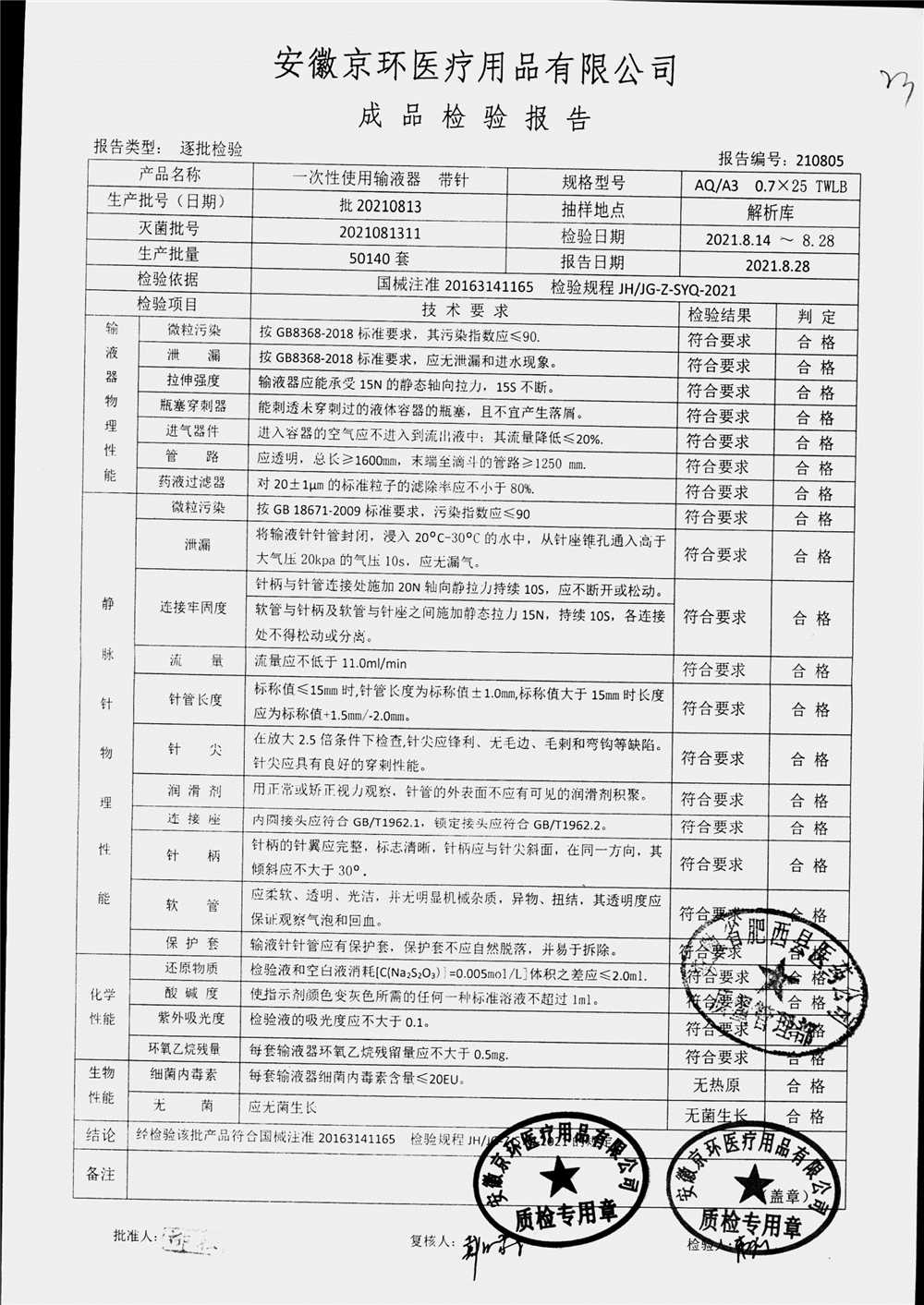 一次性使用输液器 带针 | 0.7*25 | 20210813 | 查看详情 |