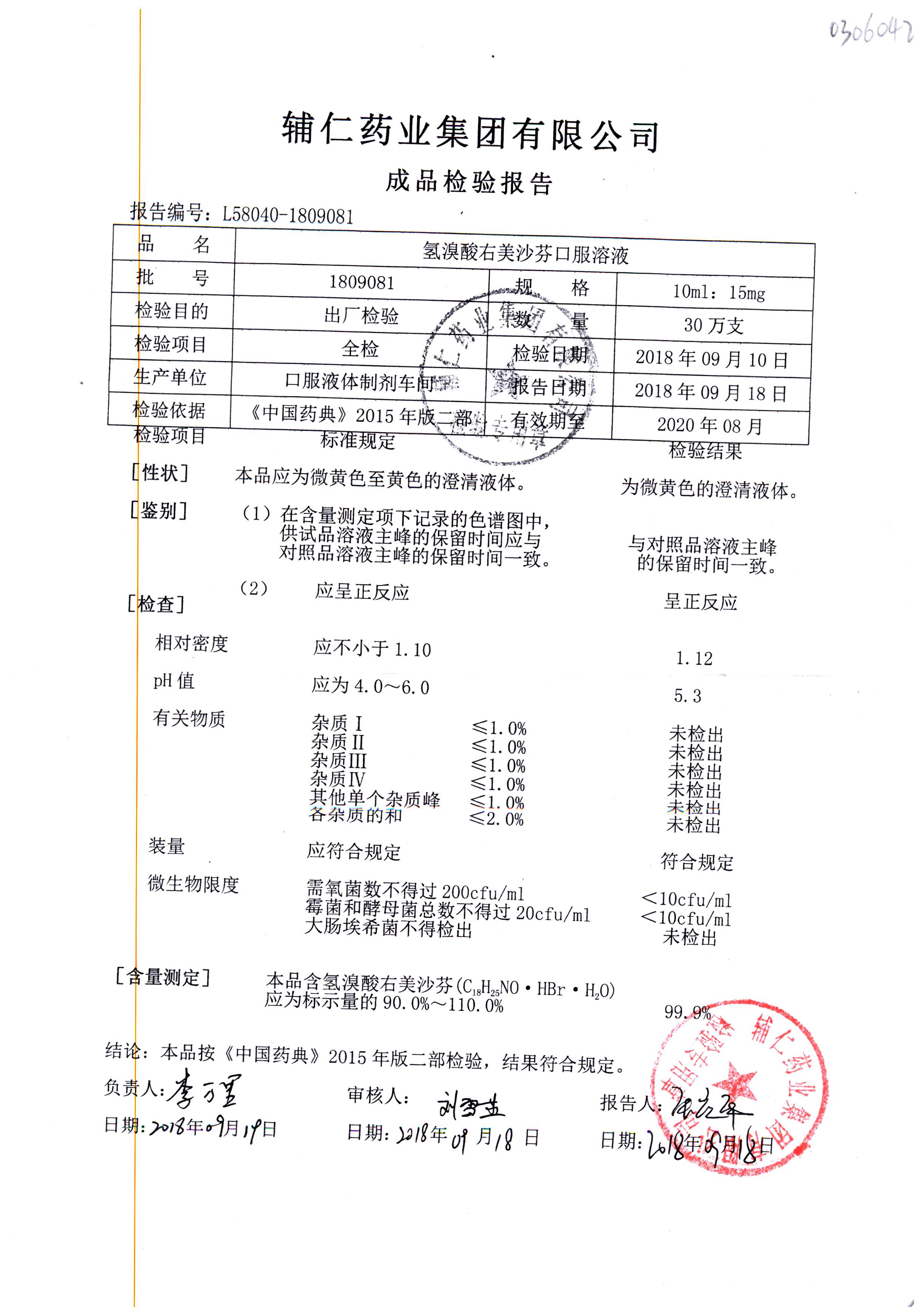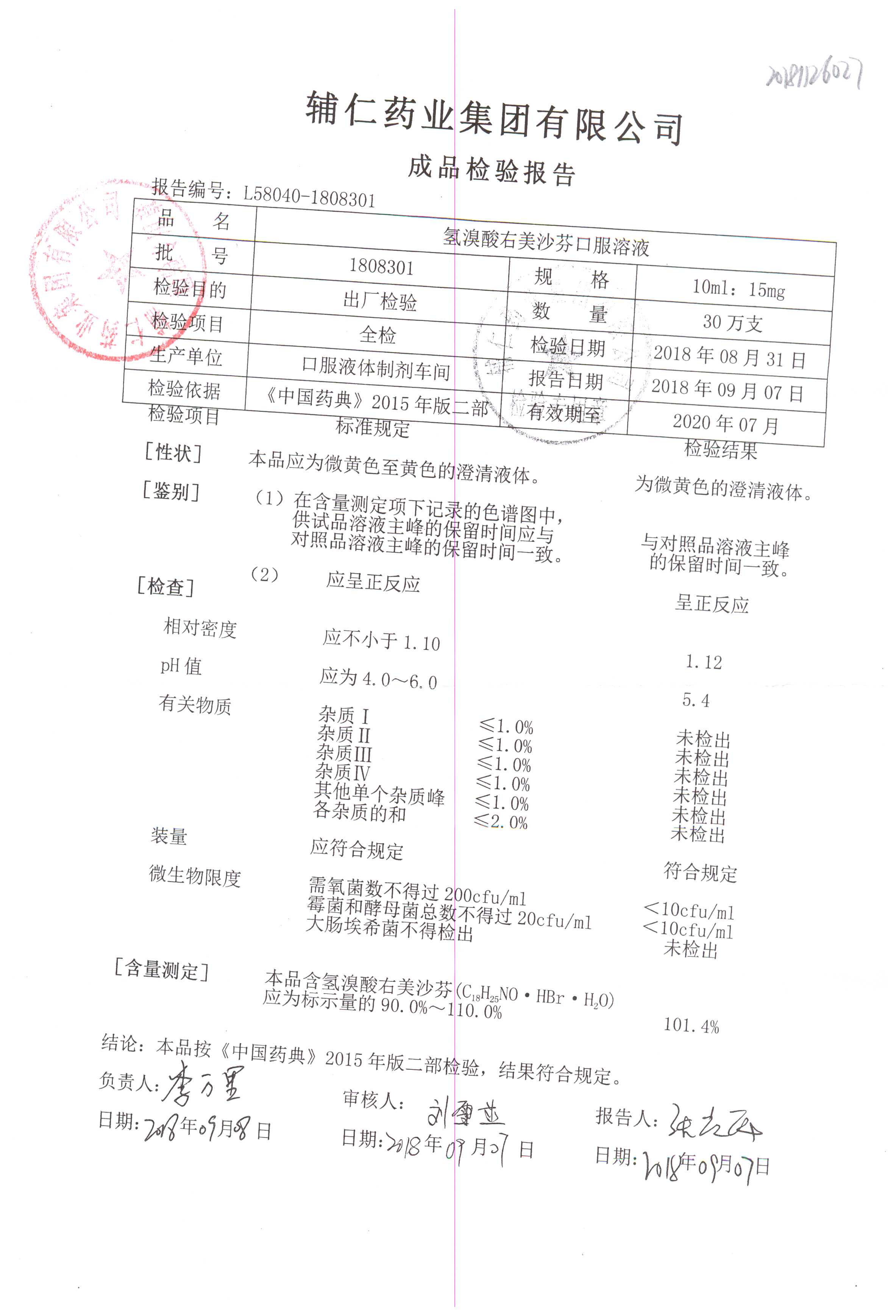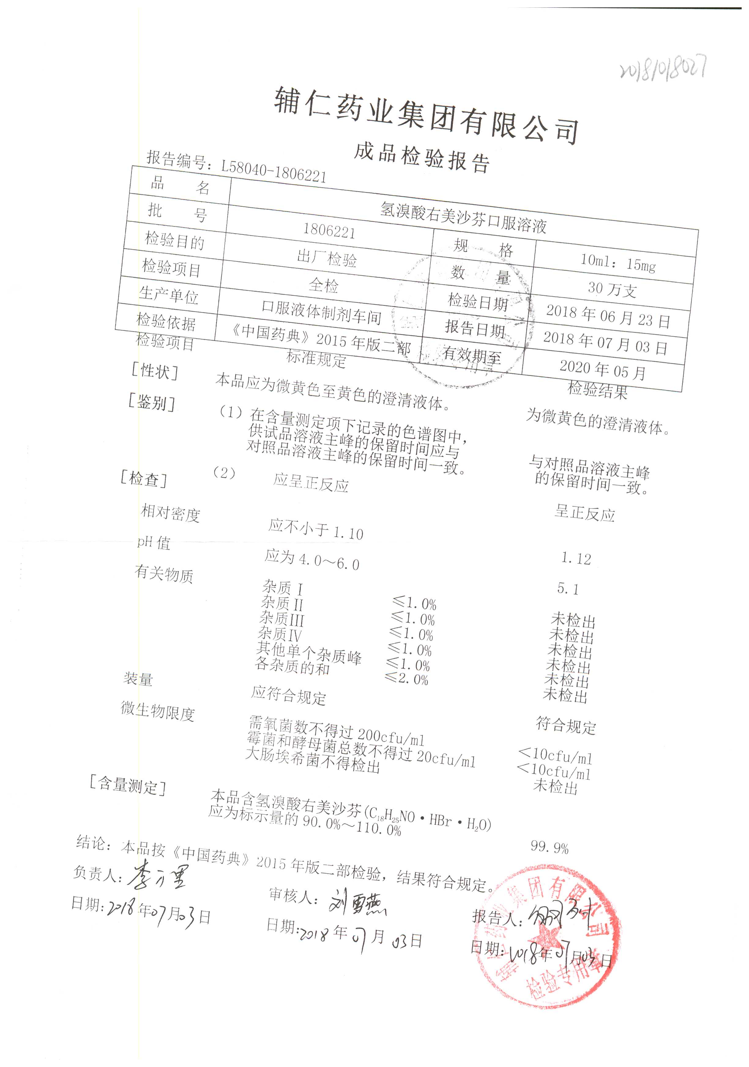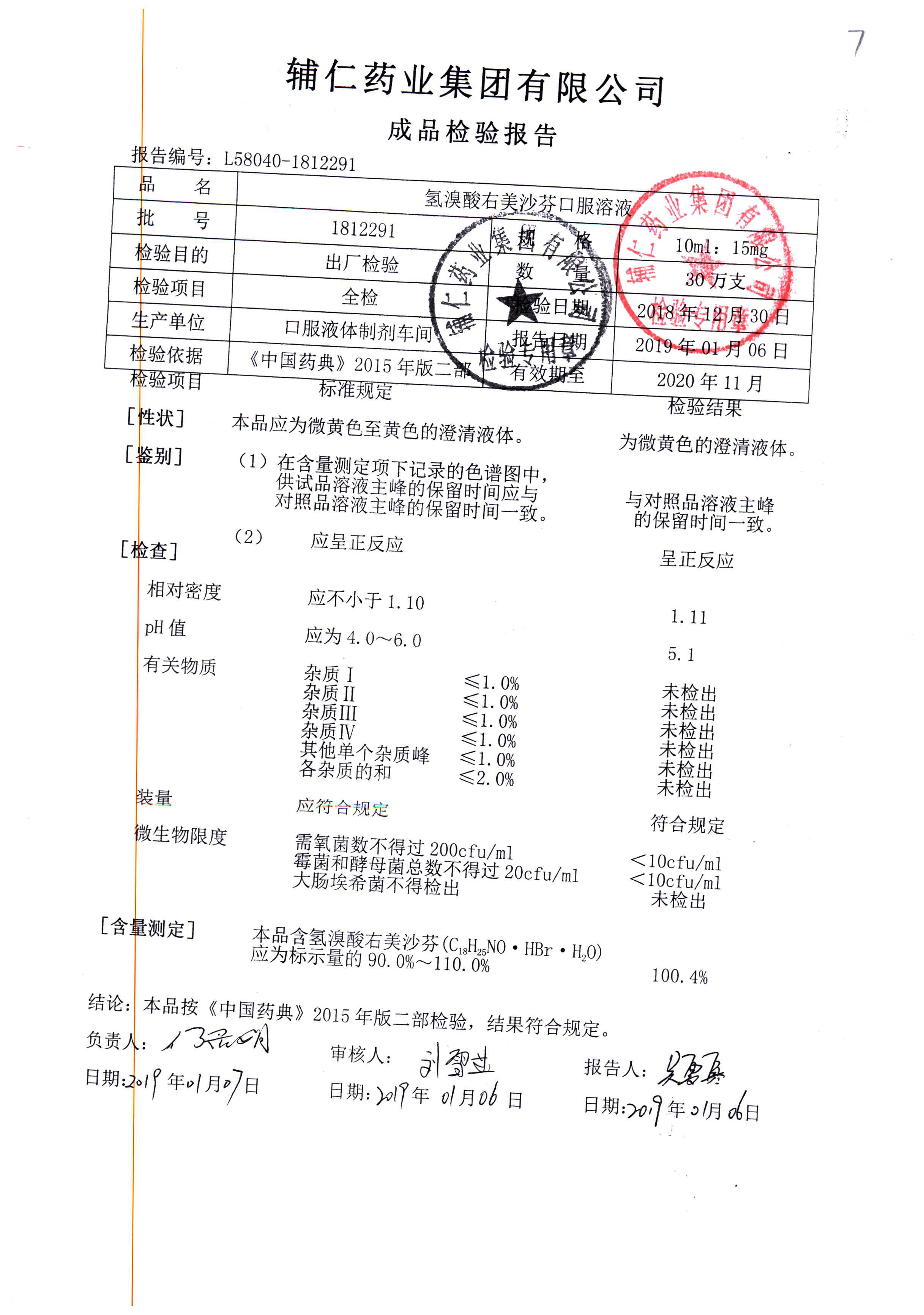氢溴酸右美沙芬口服溶液 | 10ml:15mg | 1905221 | 查看详情 |