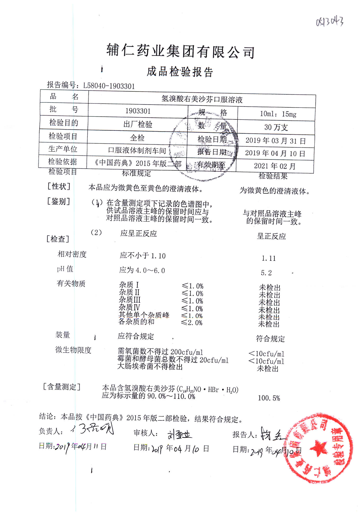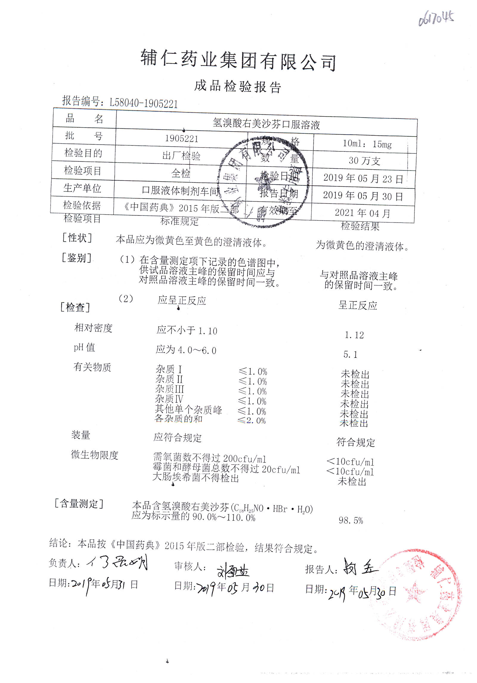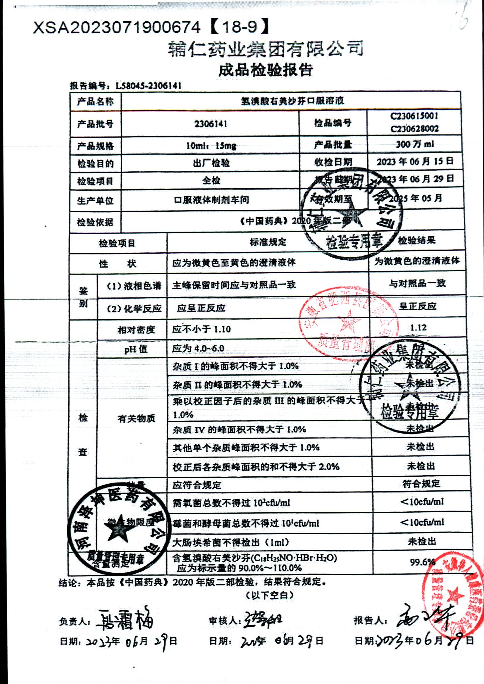 氢溴酸右美沙芬口服溶液 | 10ml:15mg | 2303061 | 查看详情 |