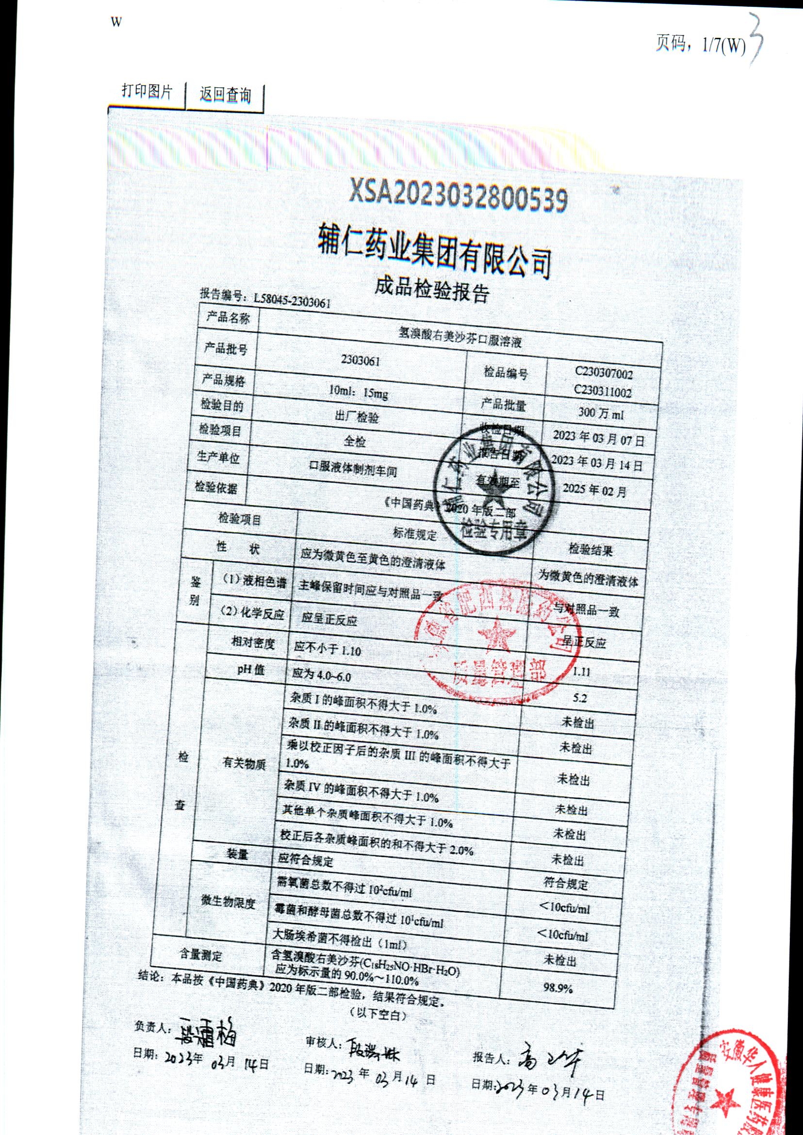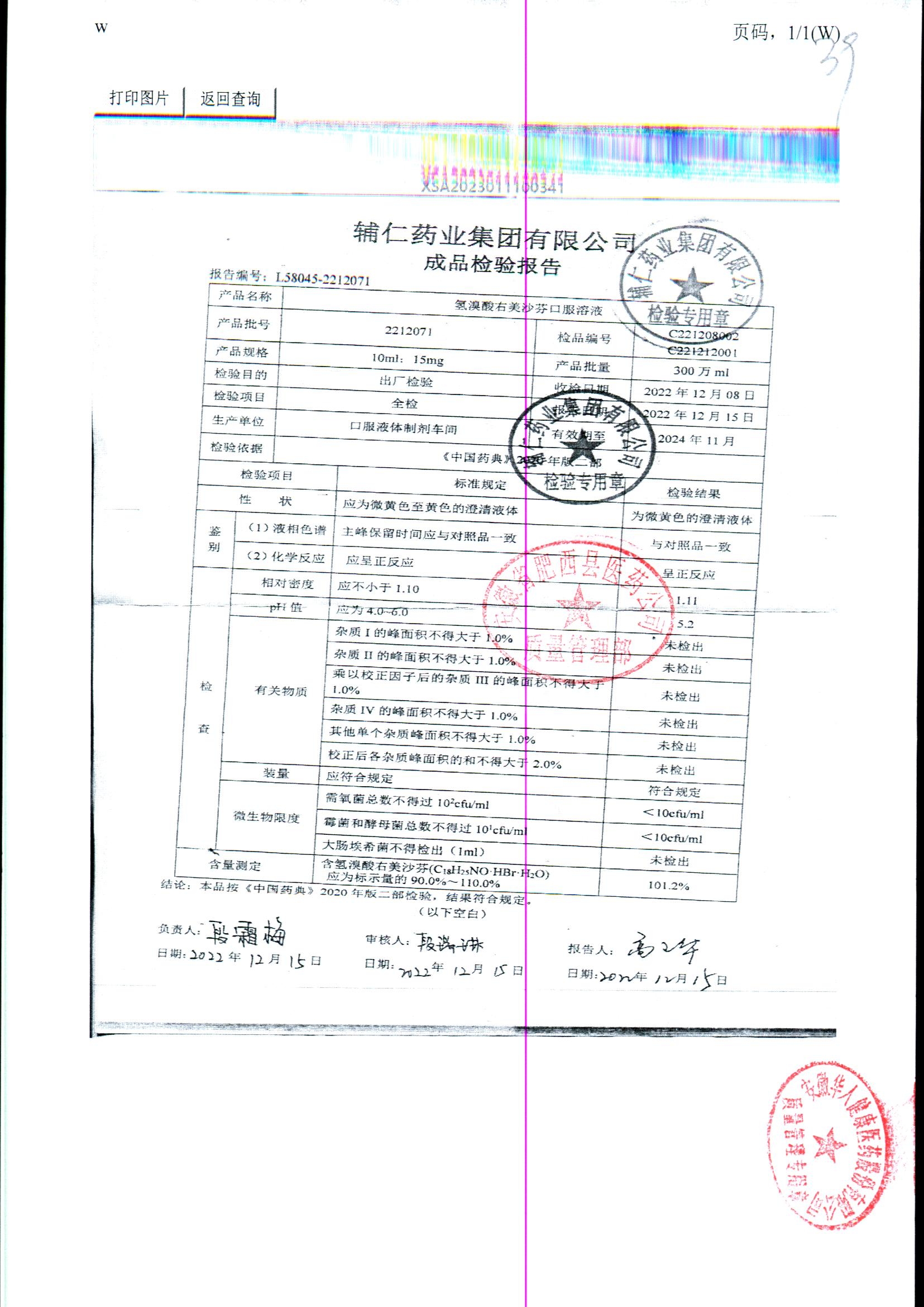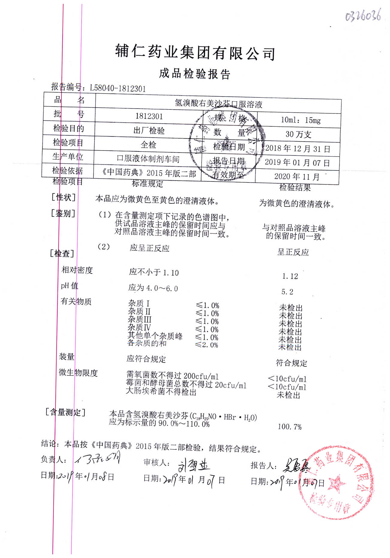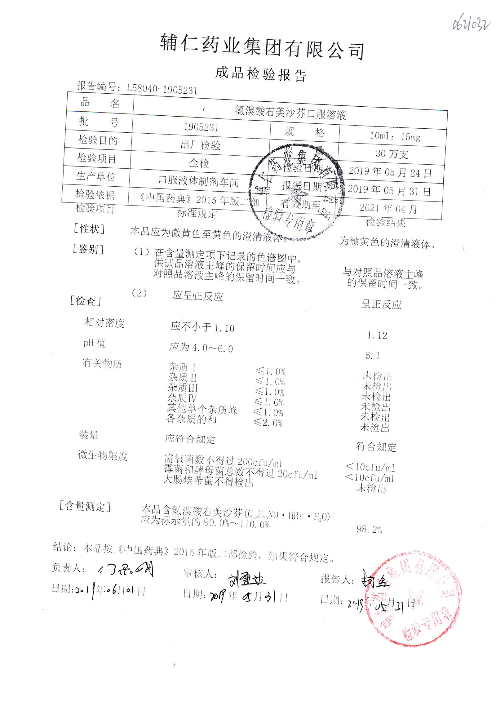 氢溴酸右美沙芬口服溶液 | 10ml:15mg | 2303061 | 查看详情 |