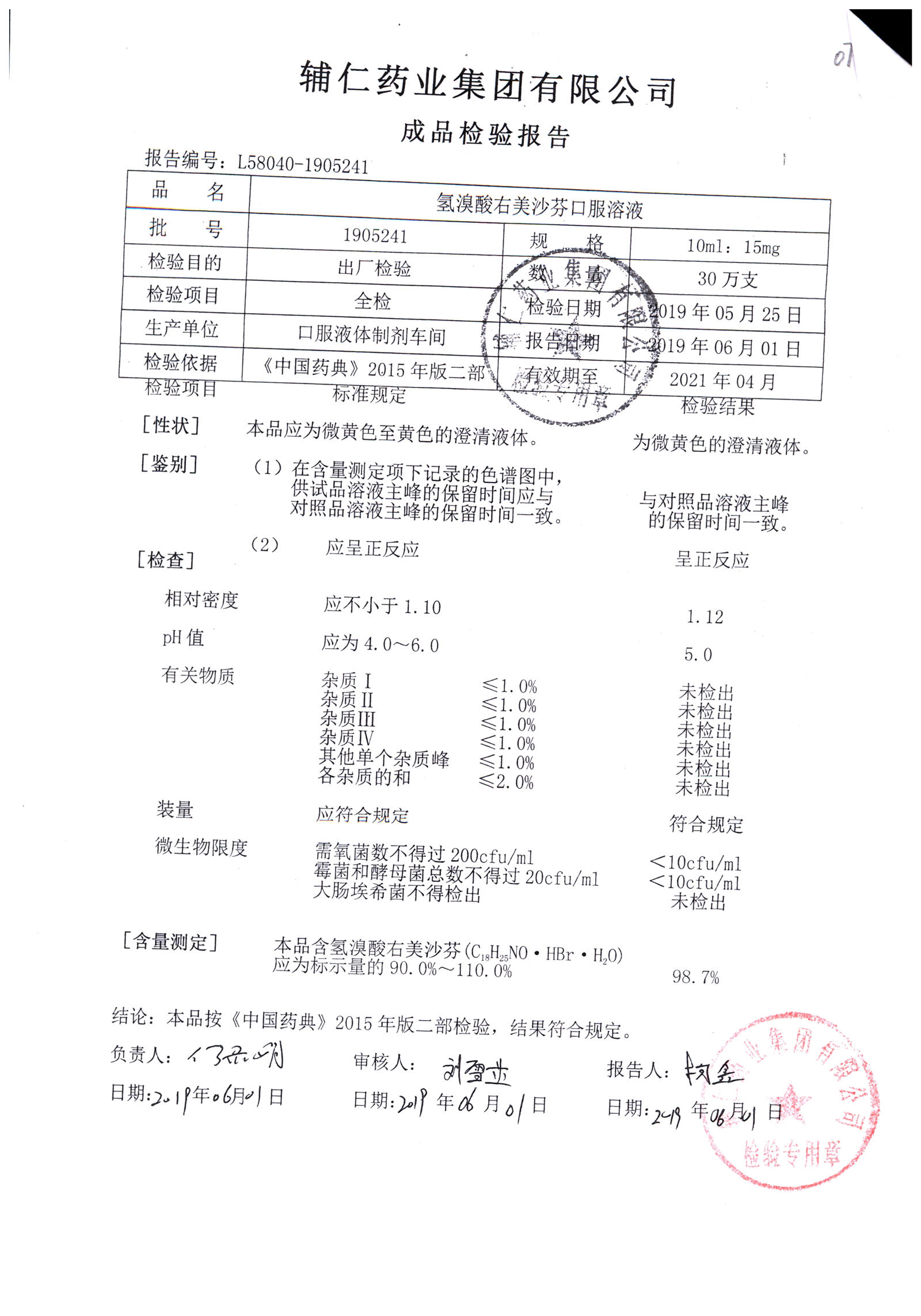 氢溴酸右美沙芬口服溶液 | 10ml:15mg | 1905241 | 查看详情 |