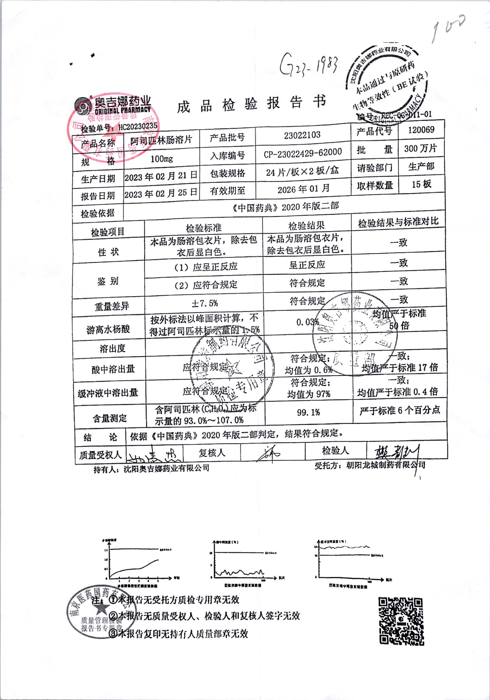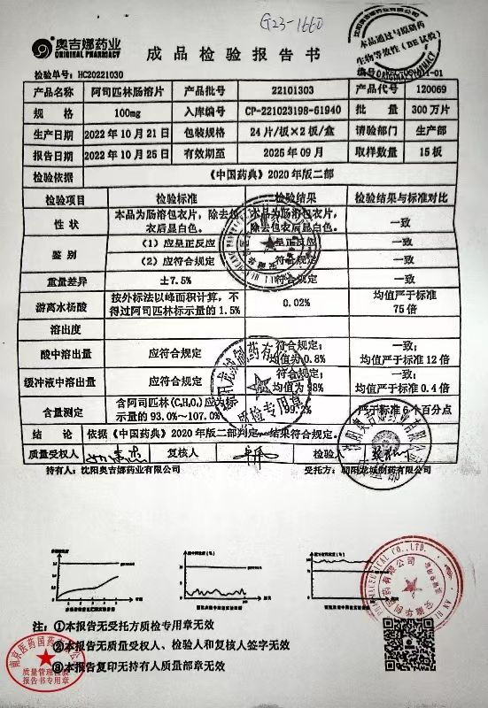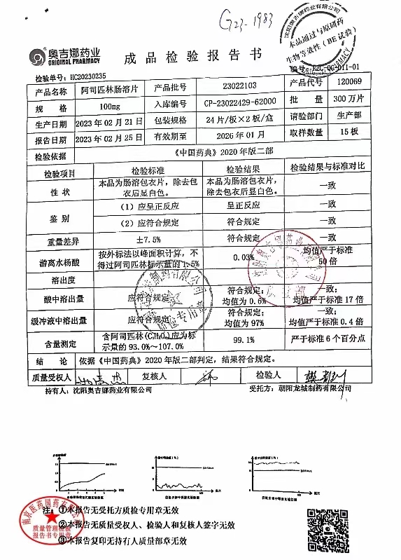 阿司匹林肠溶片 | 100mg*48片 | 23050603 | 查看详情 |