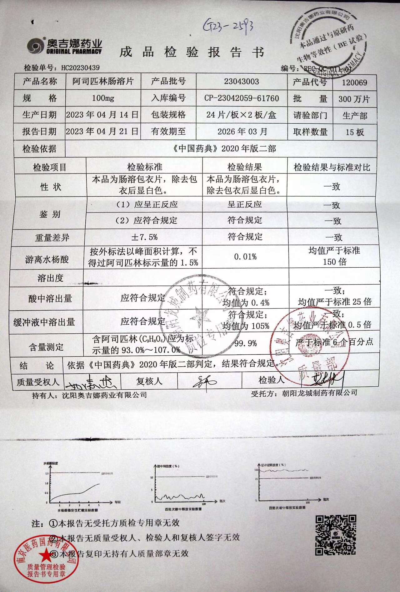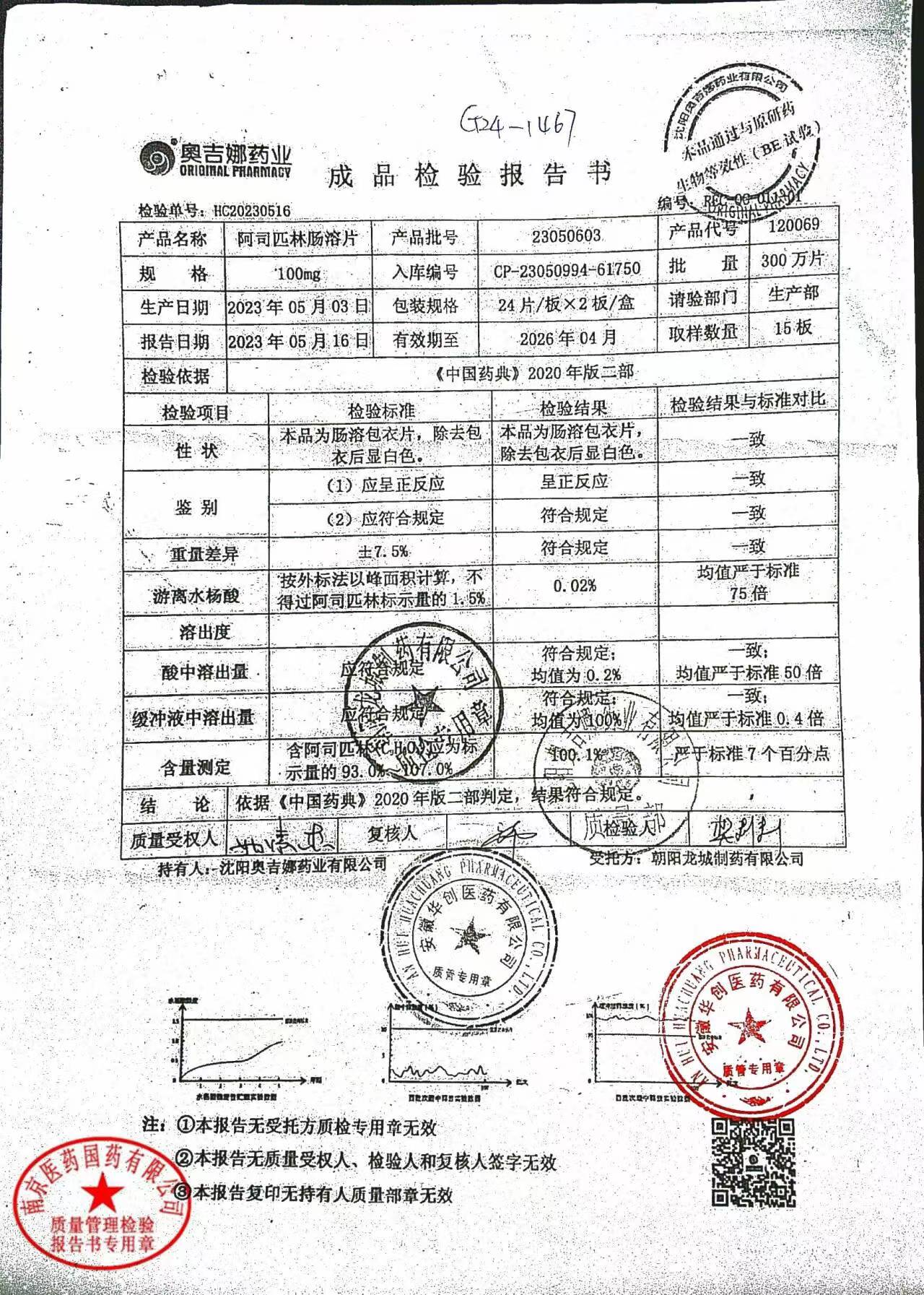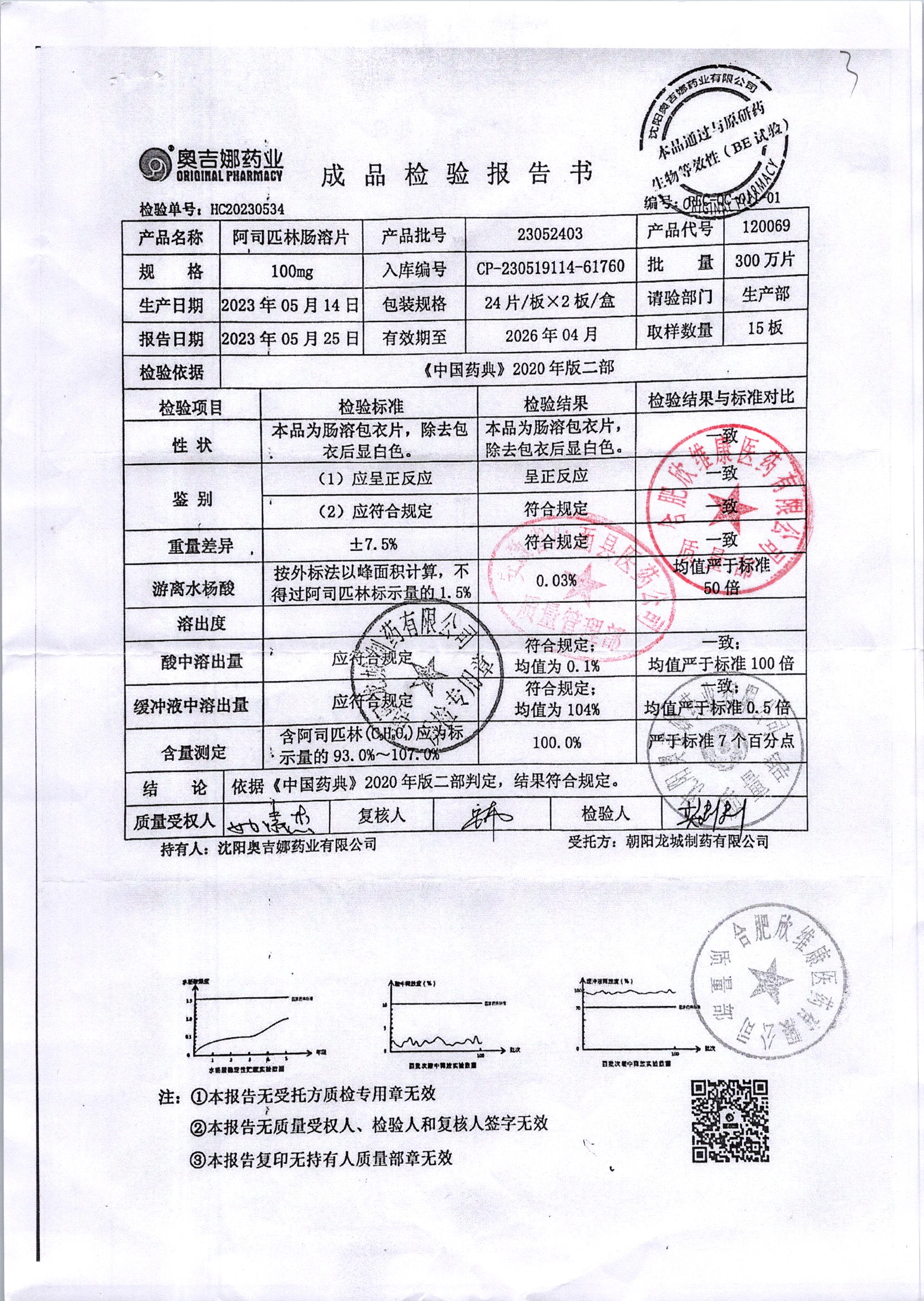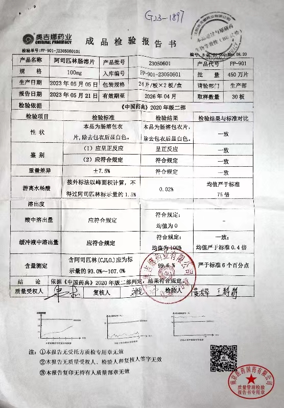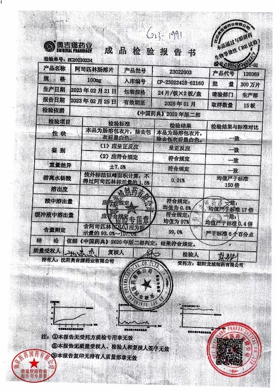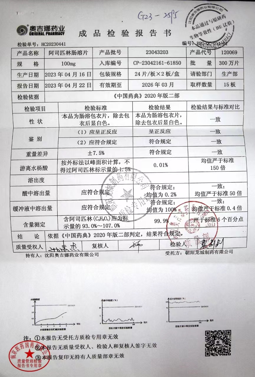 阿司匹林肠溶片 | 100mg*48片 | 23050601 | 查看详情 |
