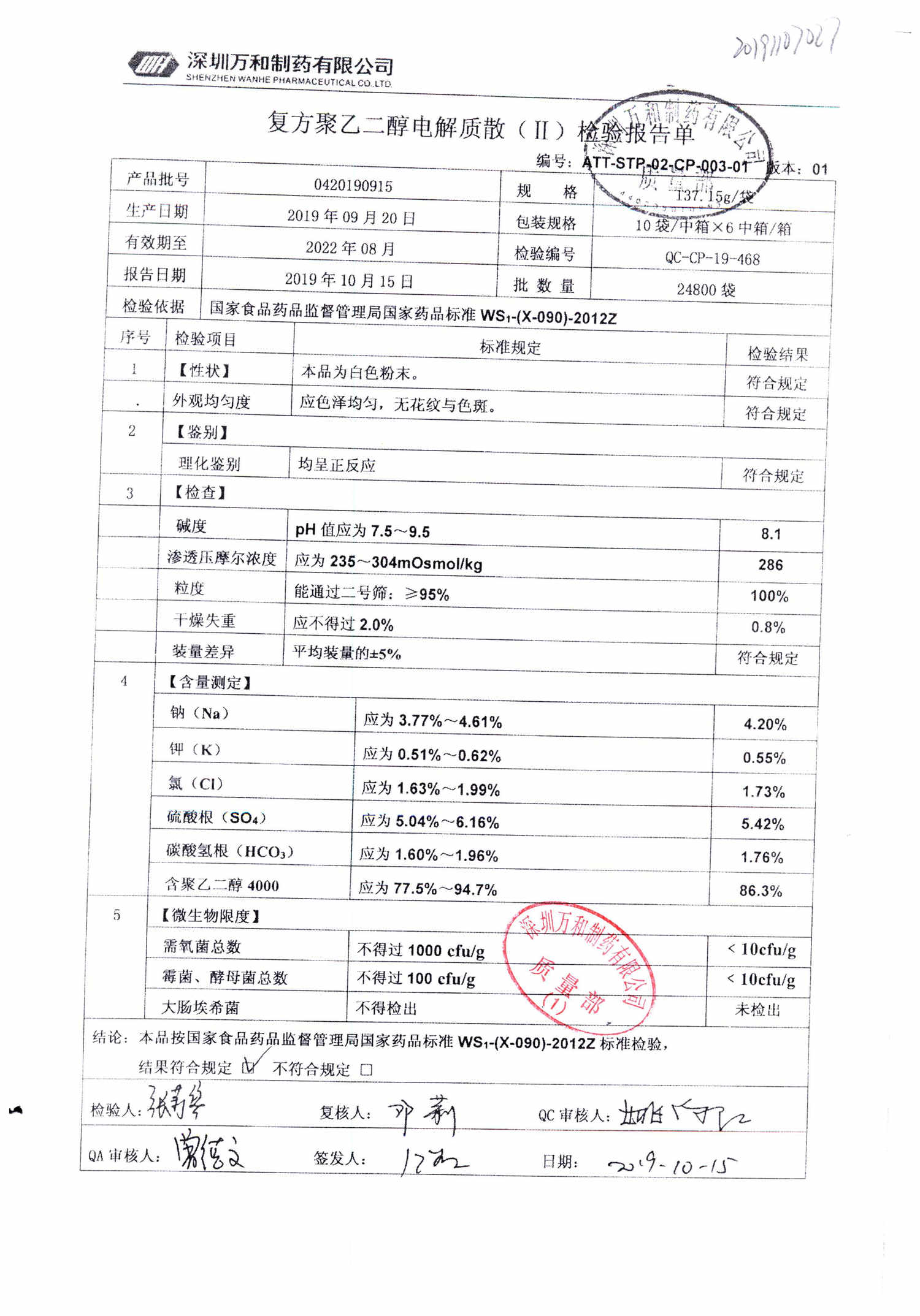 复方聚乙二醇电解质散(II) | 137.15g*10袋 | 0420190915 | 查看详情 |