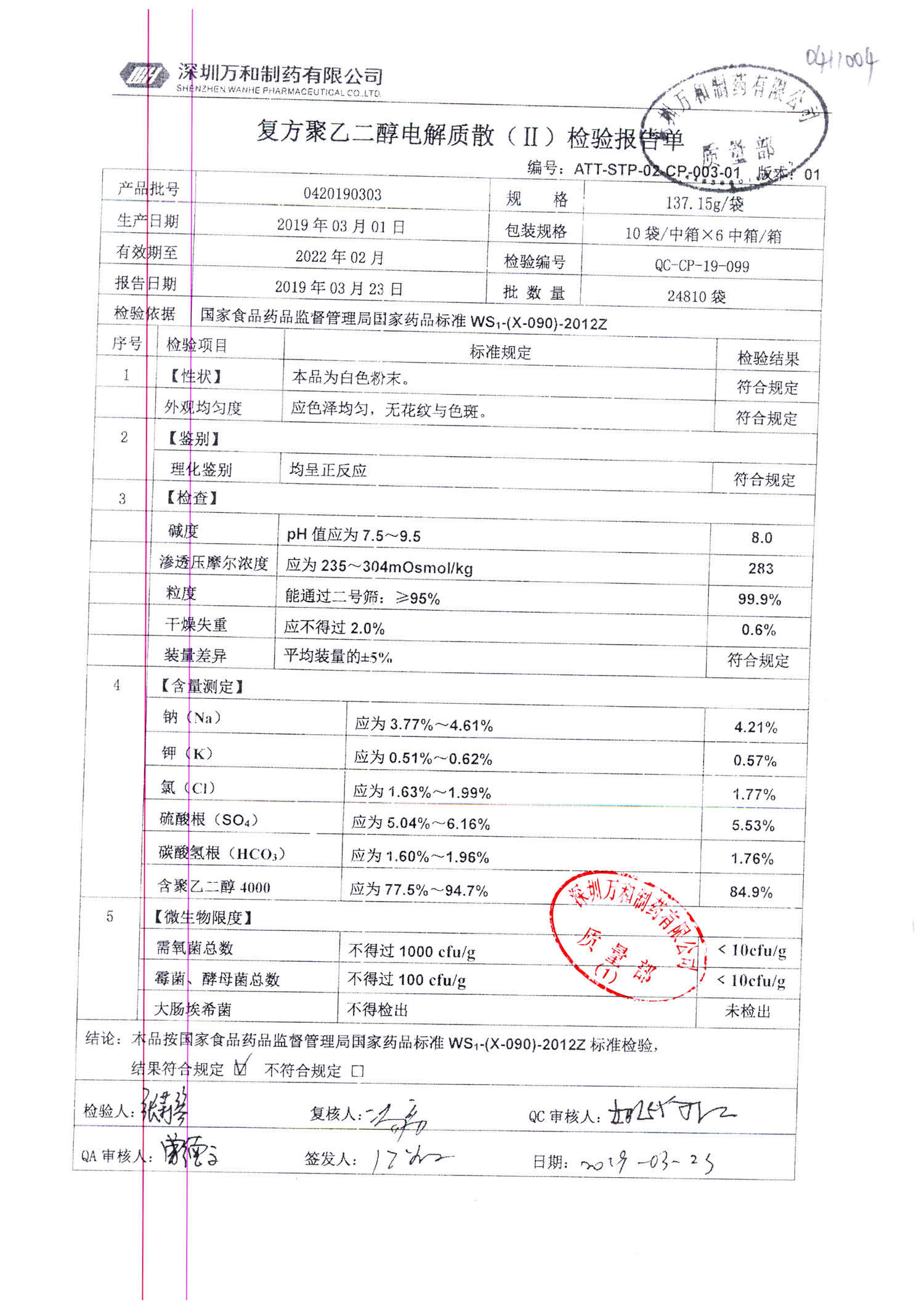 复方聚乙二醇电解质散(II) | 137.15g*10袋 | 0420190303 | 查看详情 |