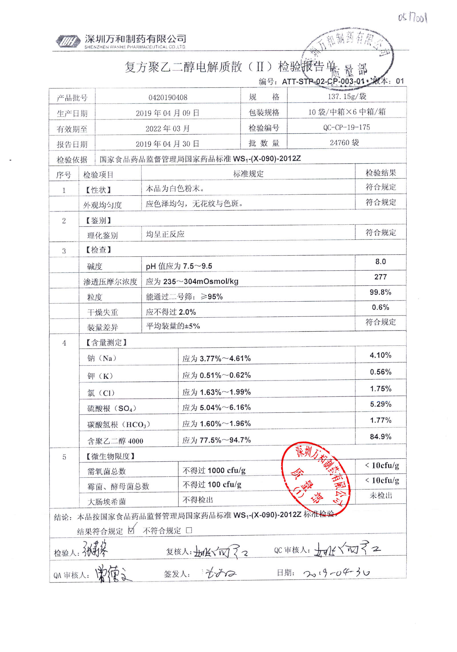 复方聚乙二醇电解质散(II) | 137.15g*10袋 | 0420190408 | 查看详情 |