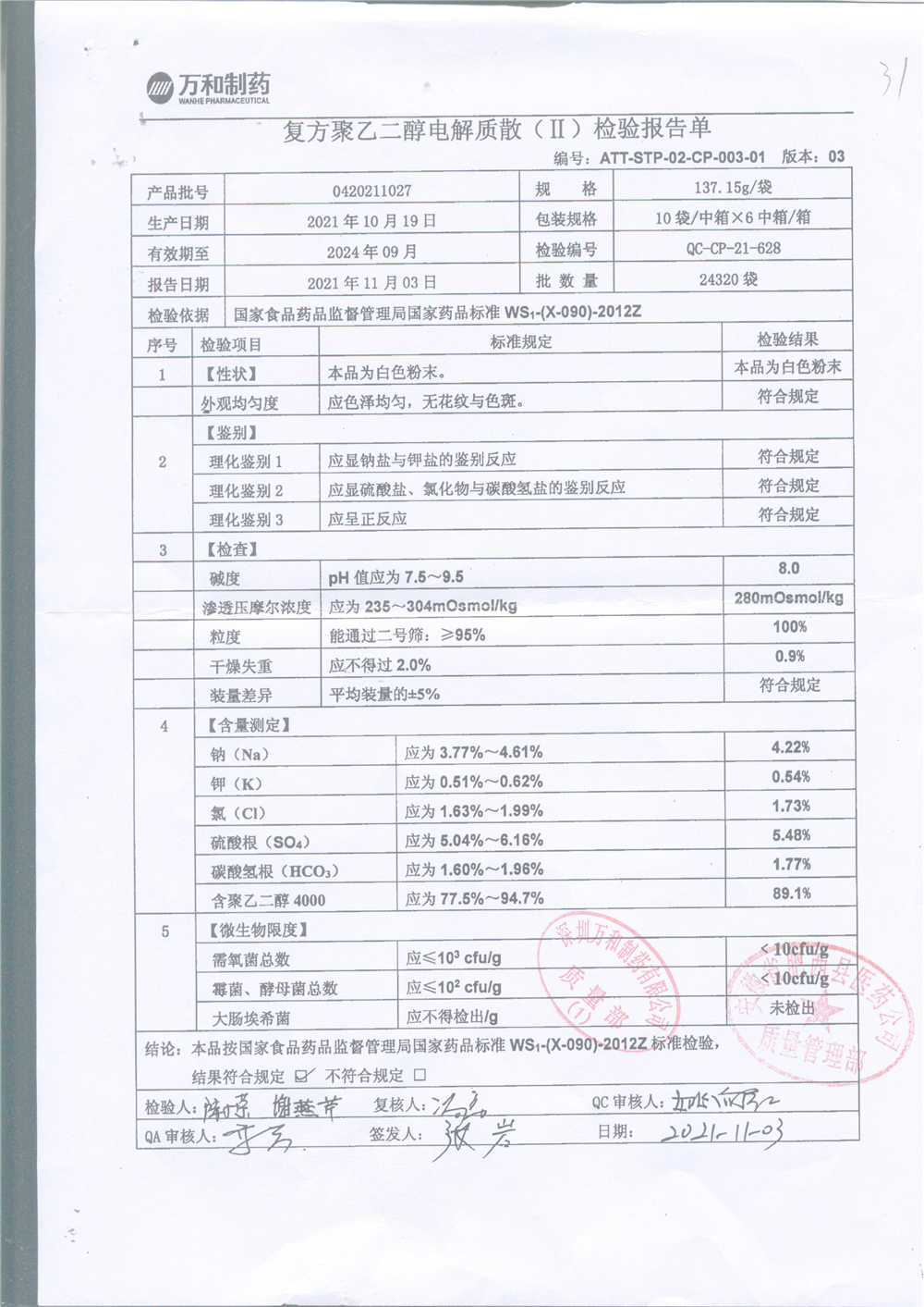 复方聚乙二醇电解质散(II) | 137.15g*10袋 | 0420210106 | 查看详情 |