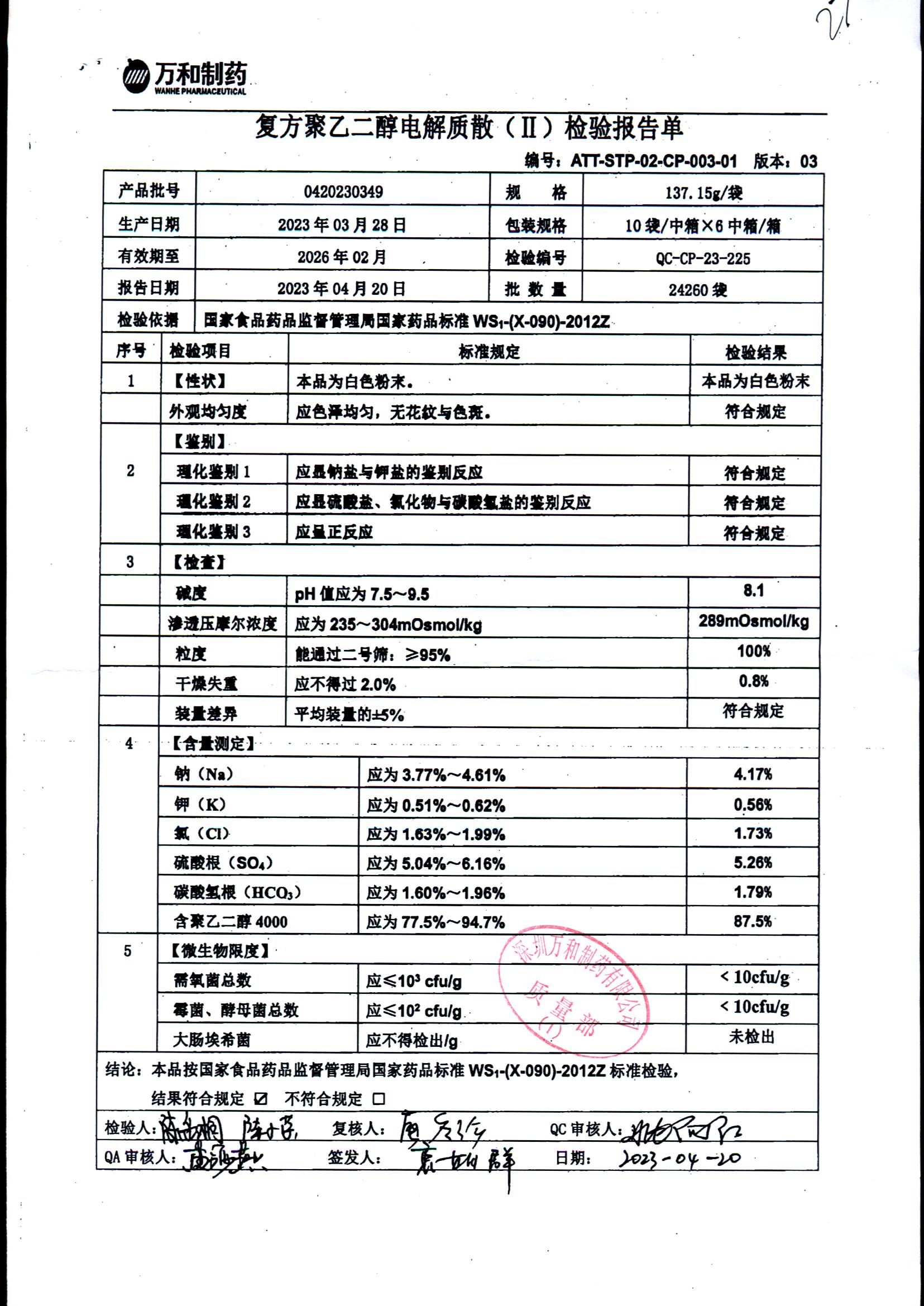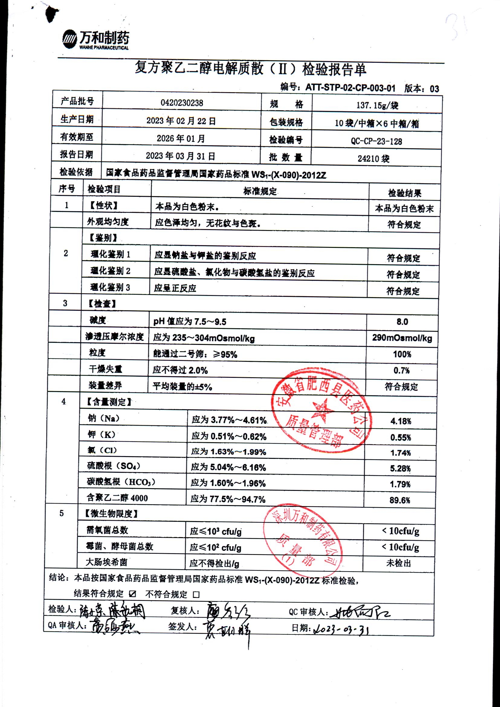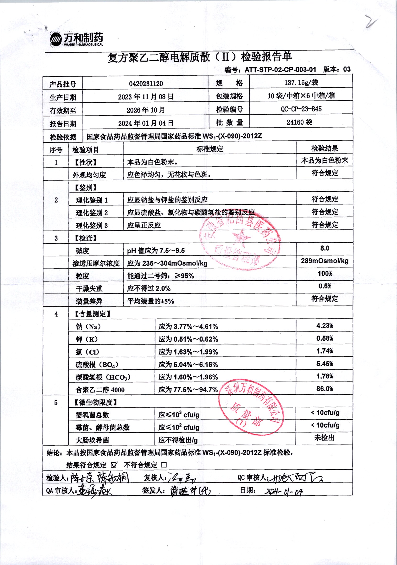 复方聚乙二醇电解质散(II) | 137.15g*10袋 | 0420231120 | 查看详情 |