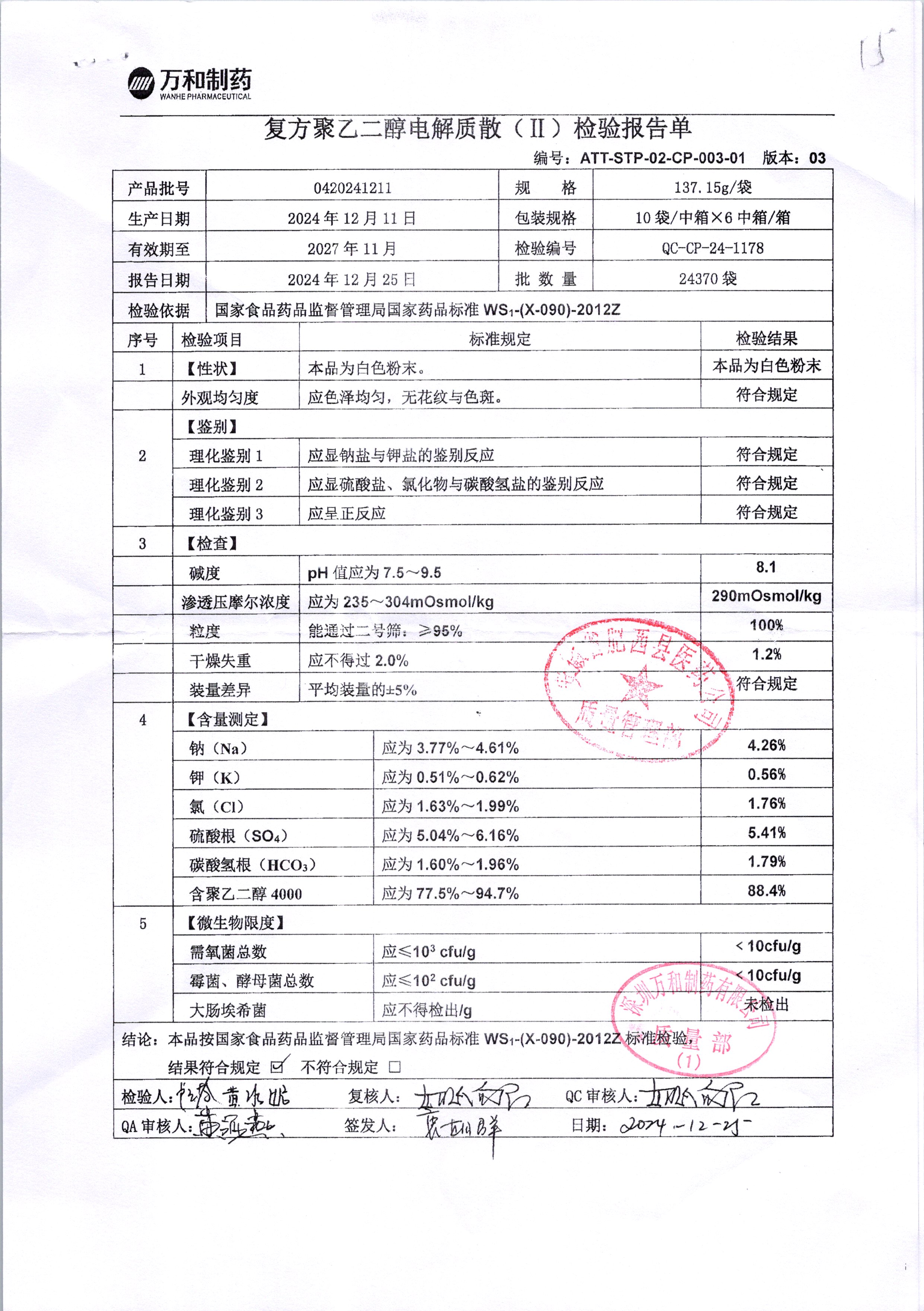 复方聚乙二醇电解质散(II) | 137.15g*10袋 | 0420241211 | 查看详情 |