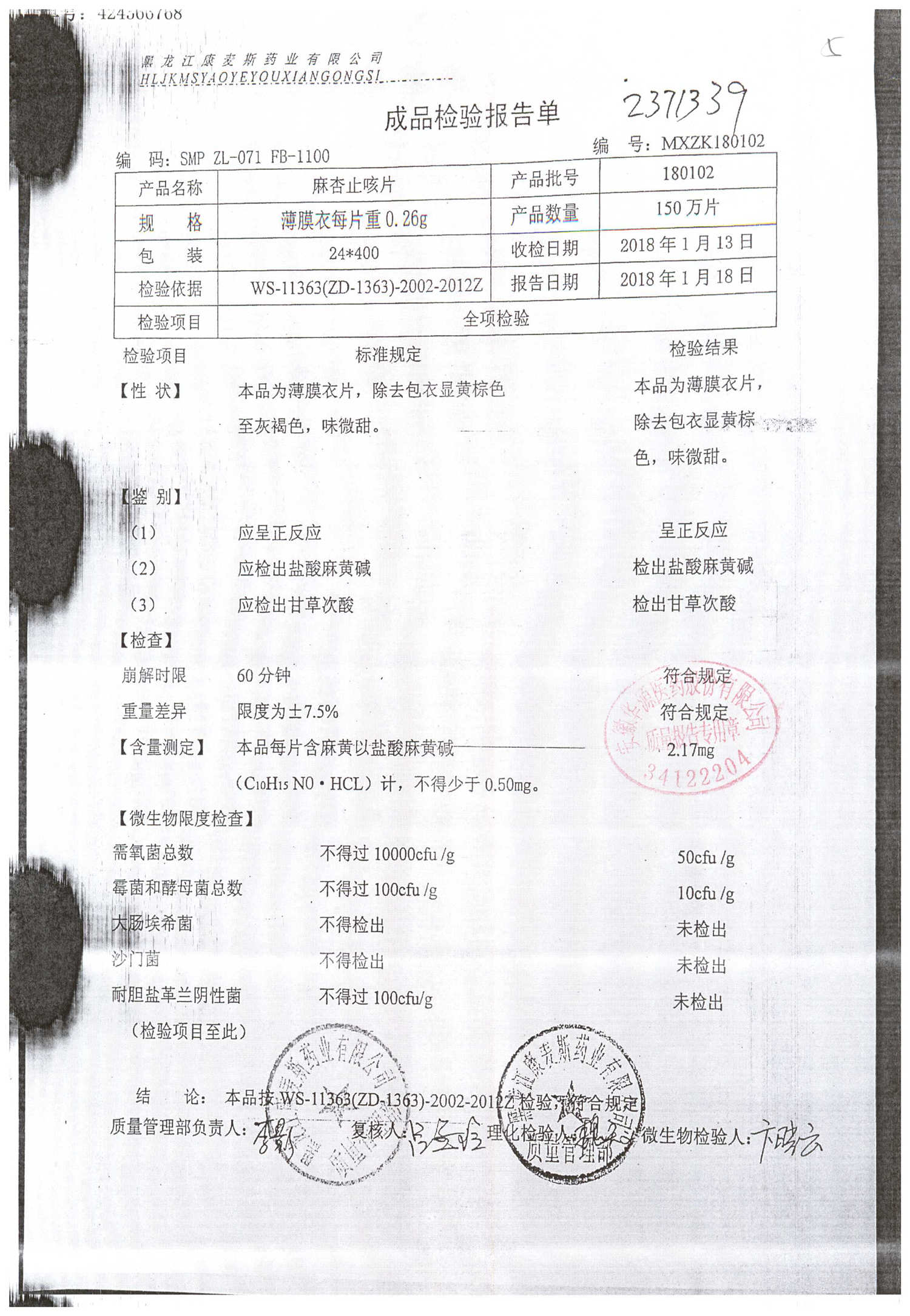 麻杏止咳片 | 0.26g | 180701 | 查看详情 |