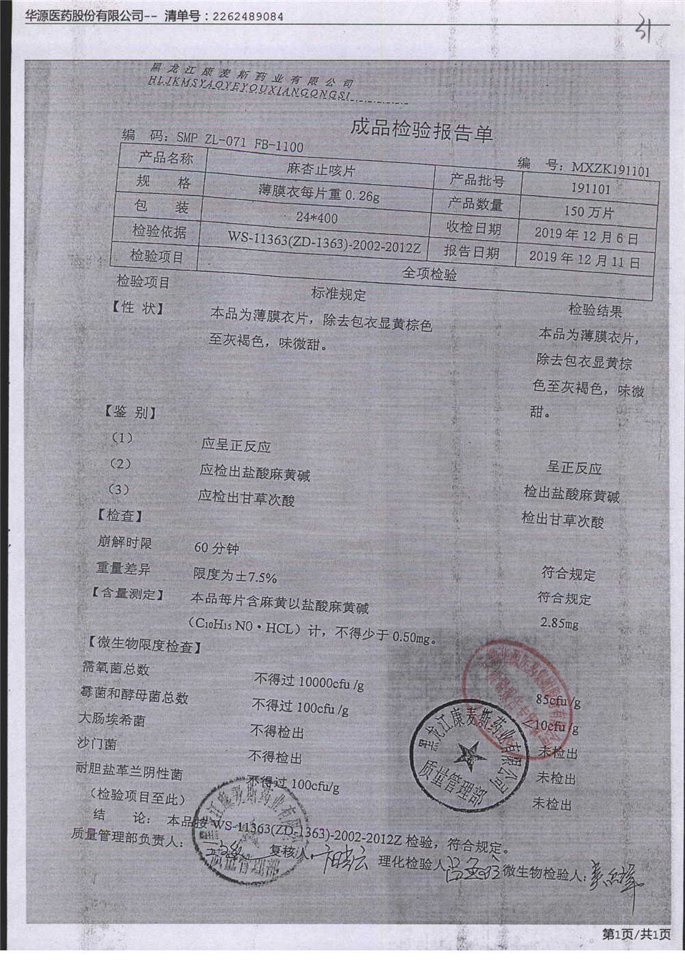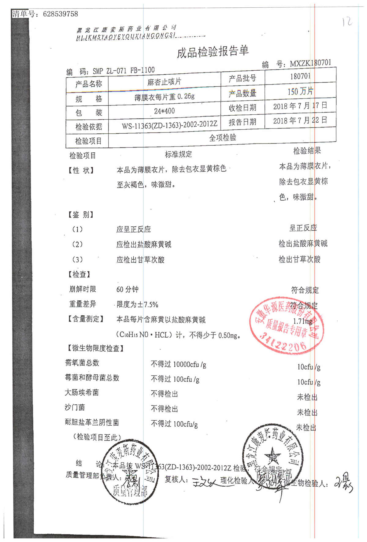 麻杏止咳片 | 0.26g | 191101 | 查看详情 |