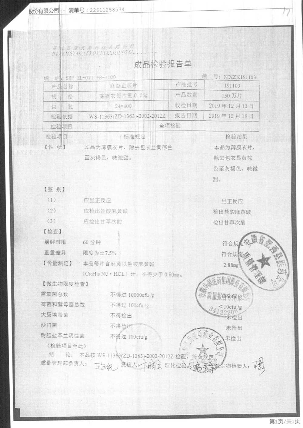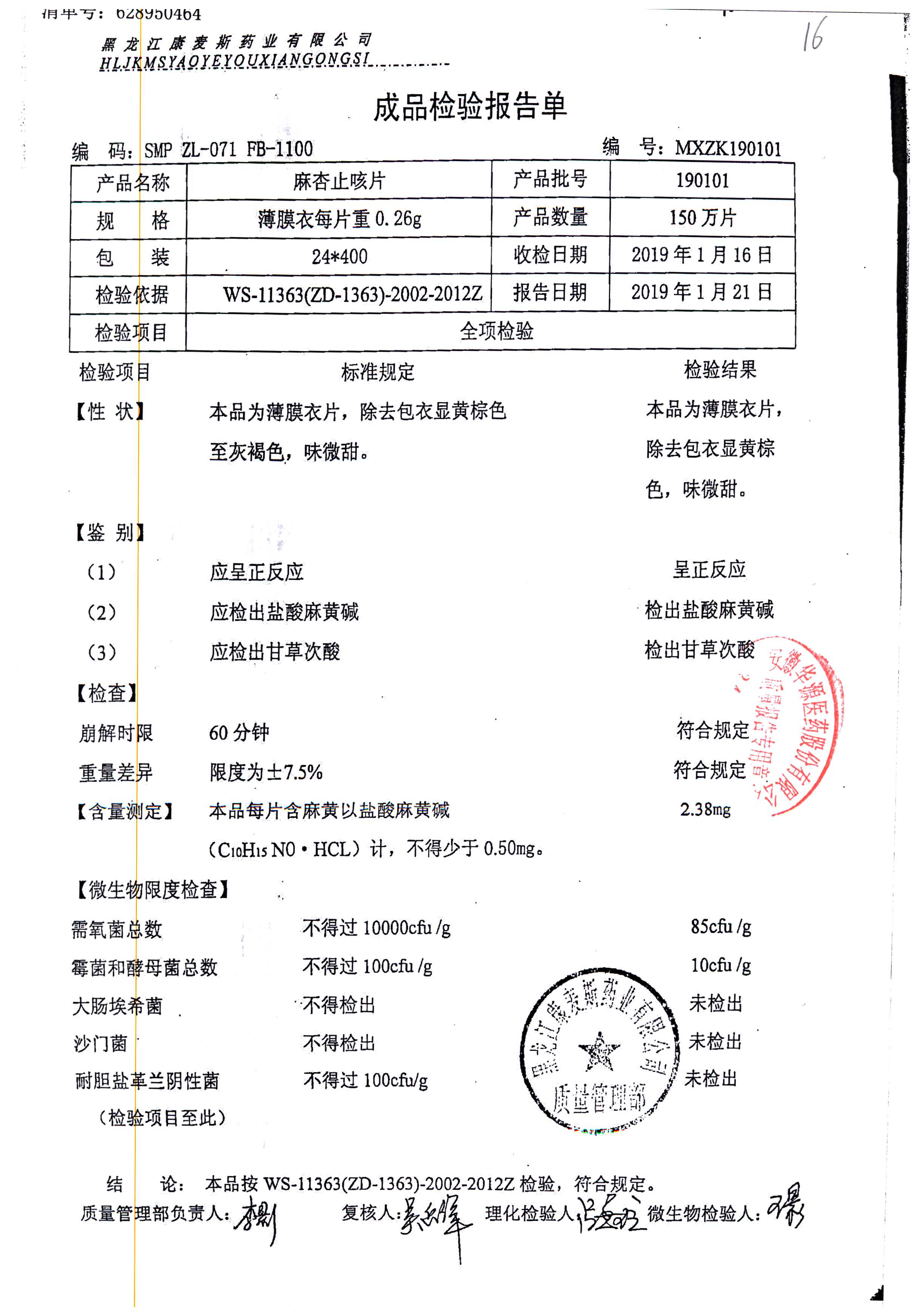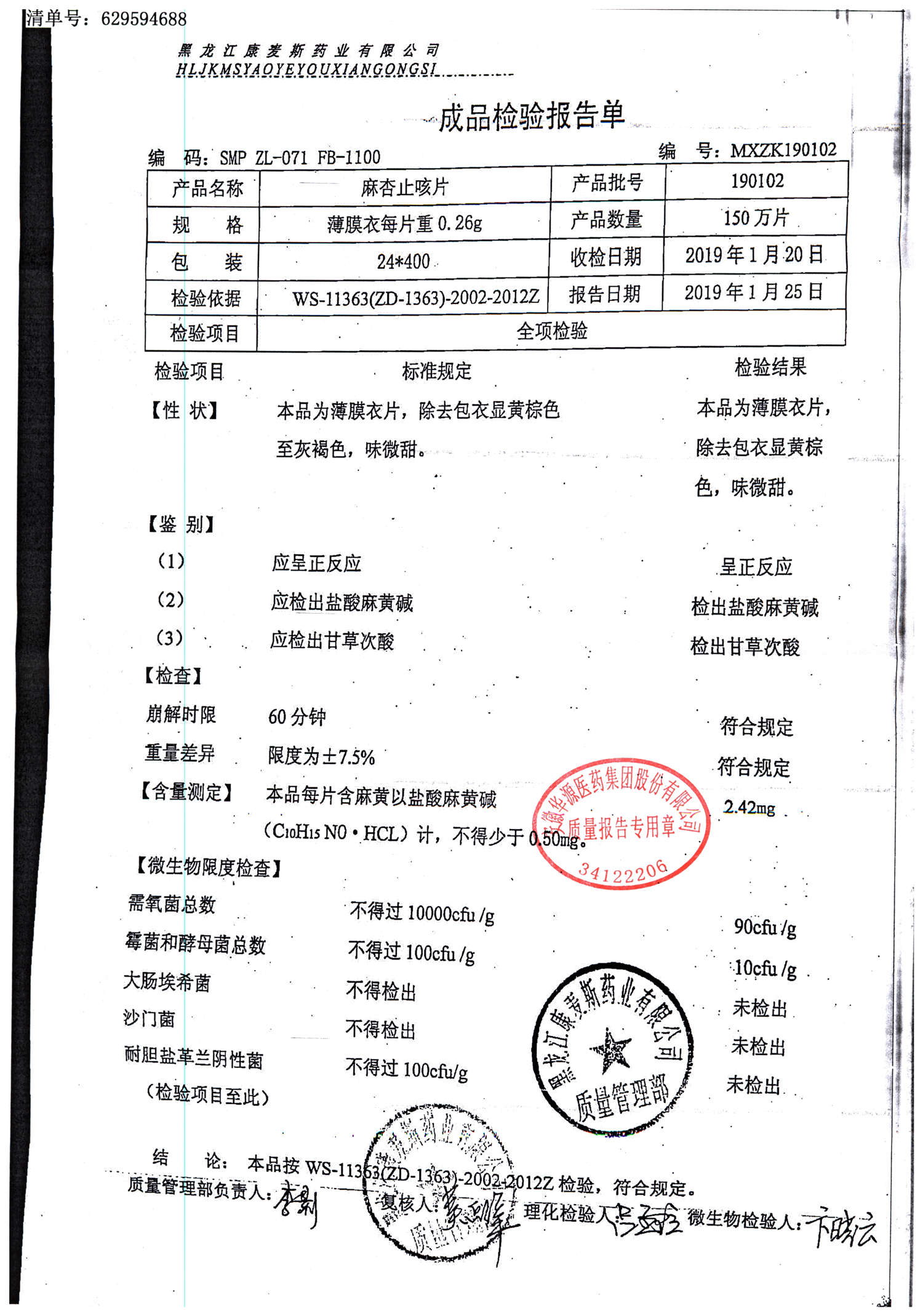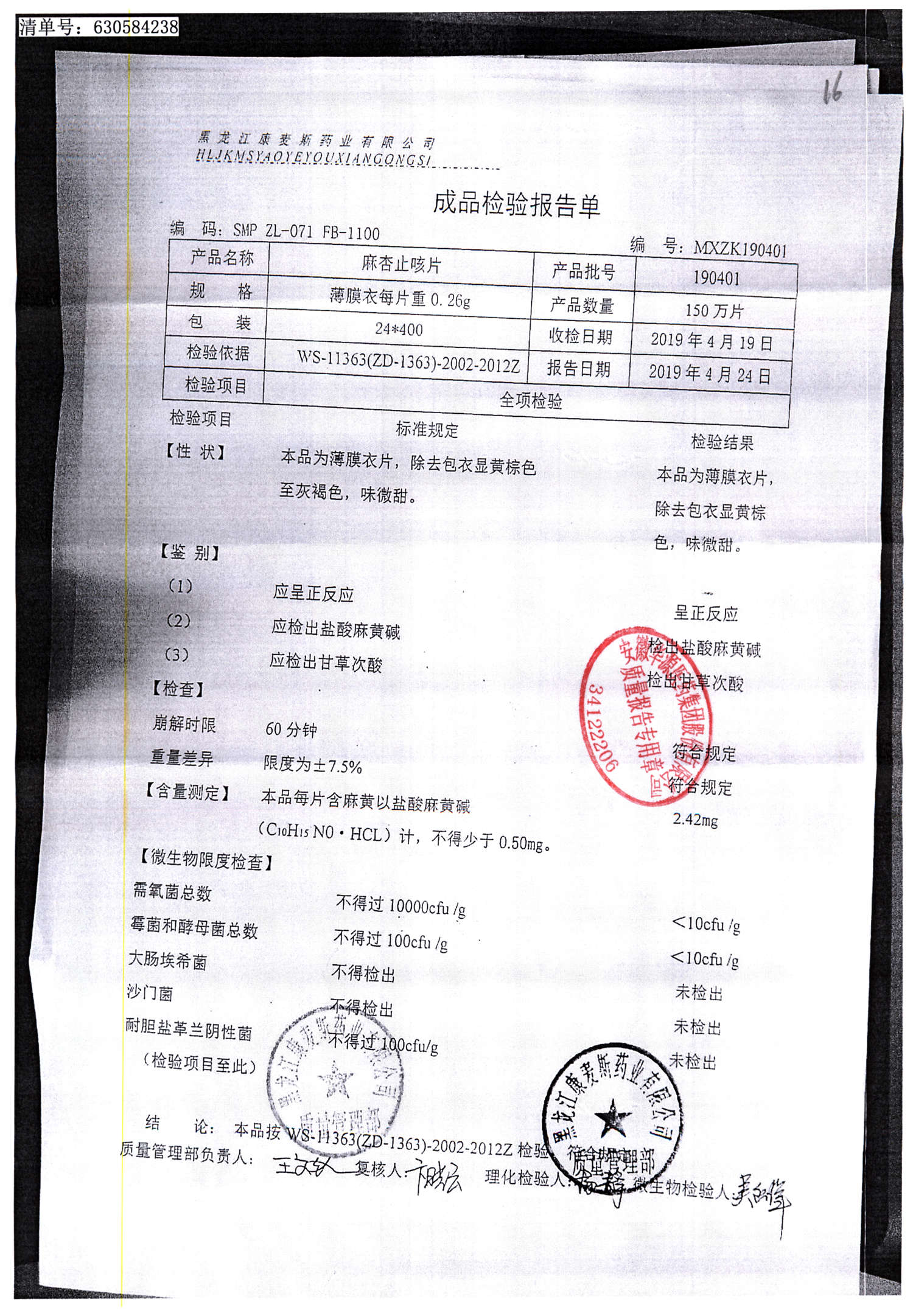 麻杏止咳片 | 0.26g | 190401 | 查看详情 |