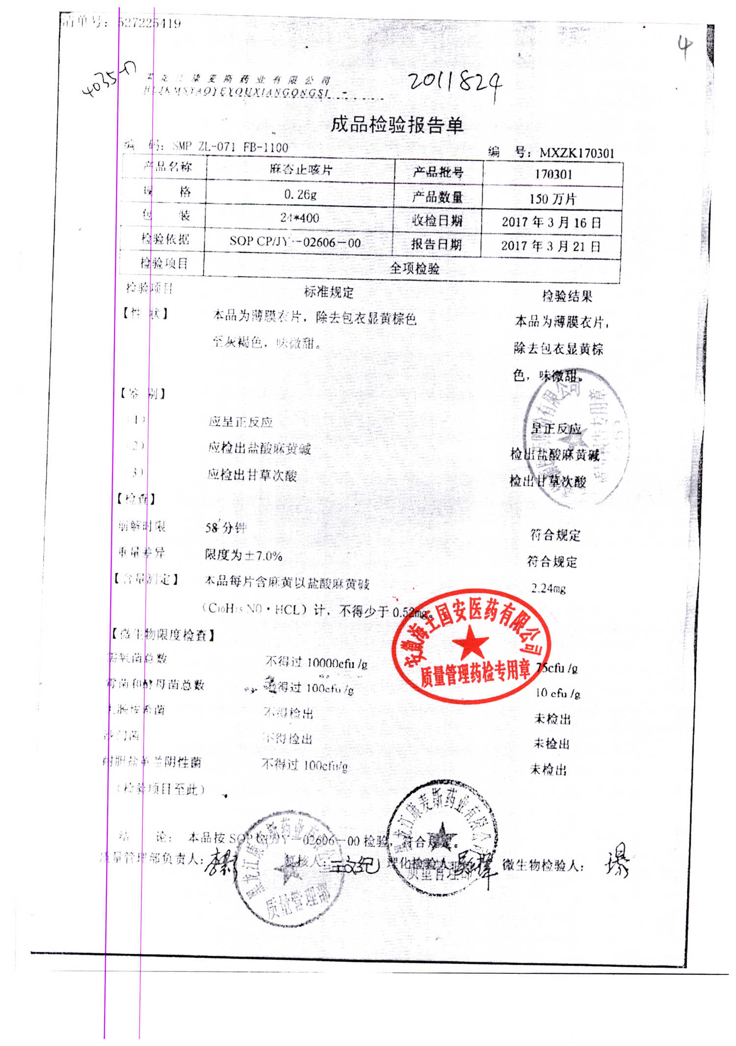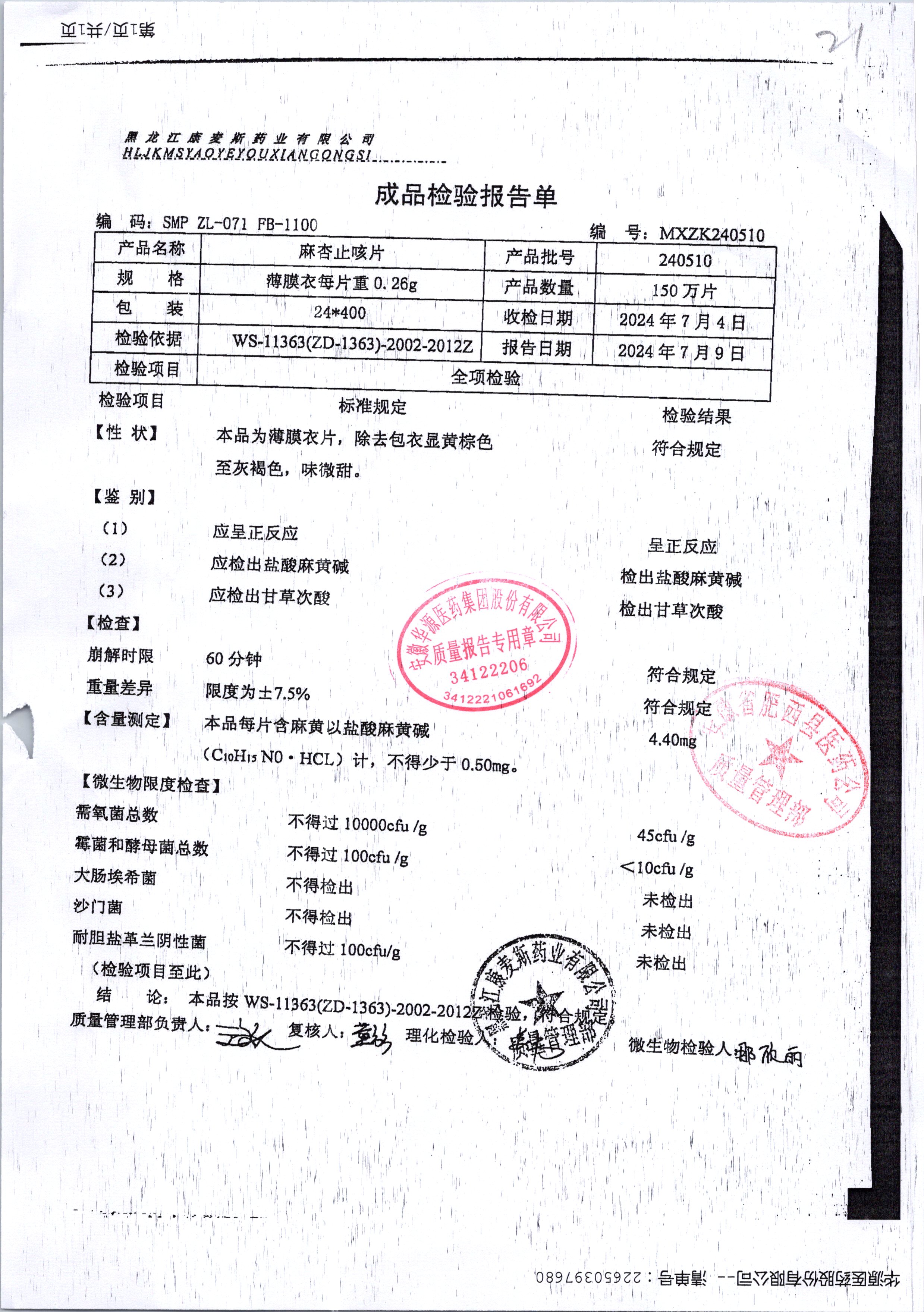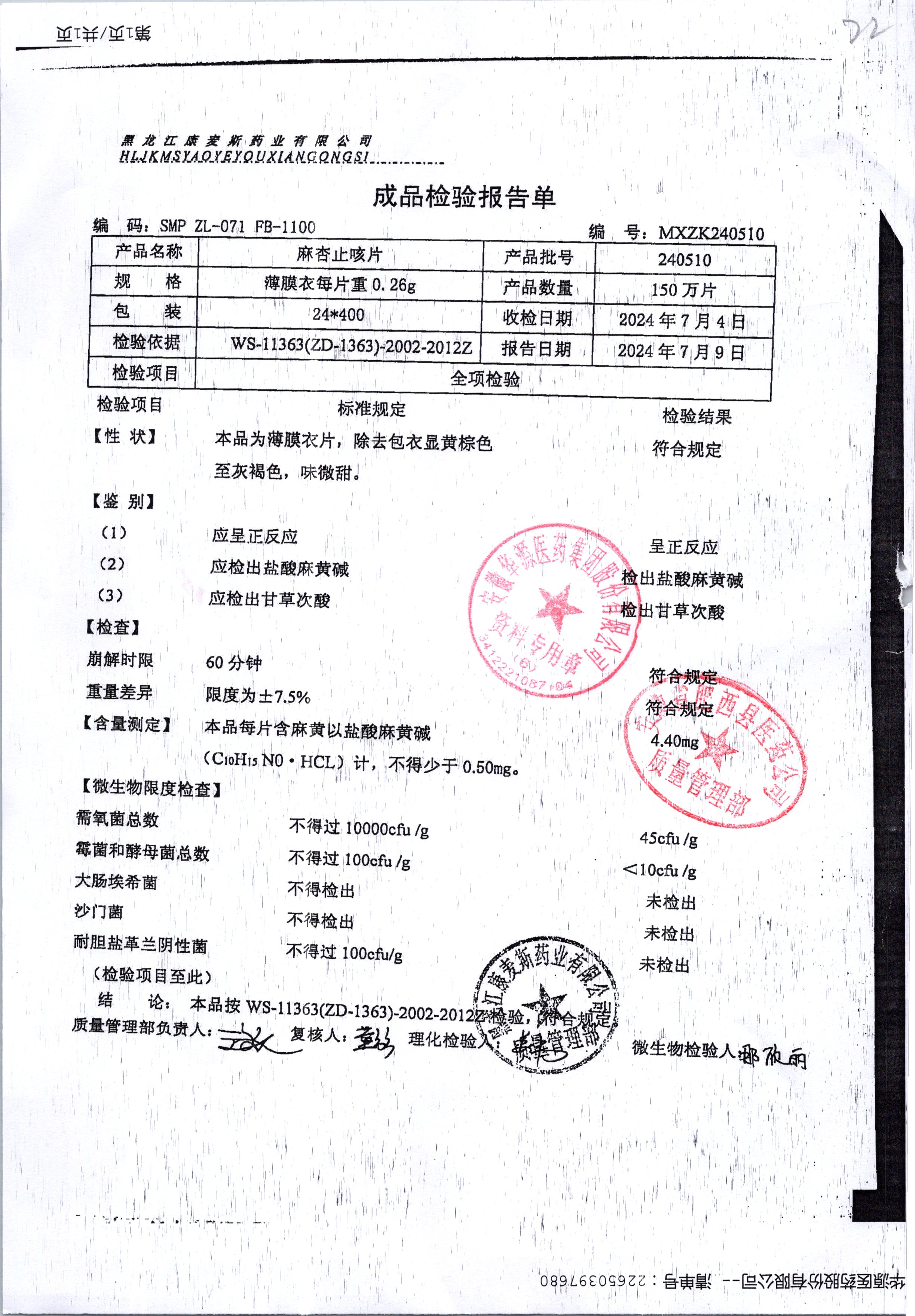 麻杏止咳片 | 0.26g | 240510/2 | 查看详情 |